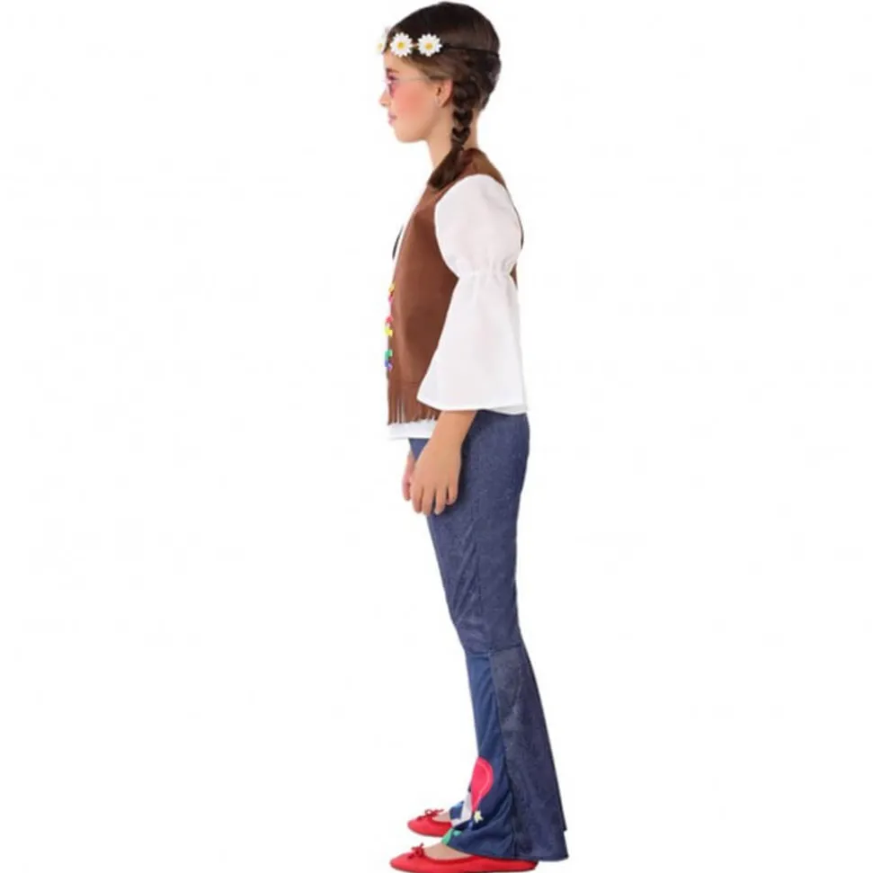 Un superbe look Peace and Love pour découvrir les années 70 ! Ce déguisement de hippie pour fille se compose d’une tunique et d’un pantalon.Cet ensemble rappelle complètement le style vestimentaire des années 70. Le pantalon couleur denim pattes d’eph est imprimé de motifs de fleurs, d’étoile et de coeur dans le bas. La tunique, quant à elle, en tissu blanc possède des manches longues et évasées et est surmontée d’un faux gilet sans manches marron à franges. Avec ce déguisement, votre enfant fera sensation à l’occasion des fêtes déguisées, notamment lors du Carnaval… Complétez-le à l’aide de plusieurs accessoires hippies comme par exemple un bandeau, des accessoires à fleurs, des lunettes rondes …