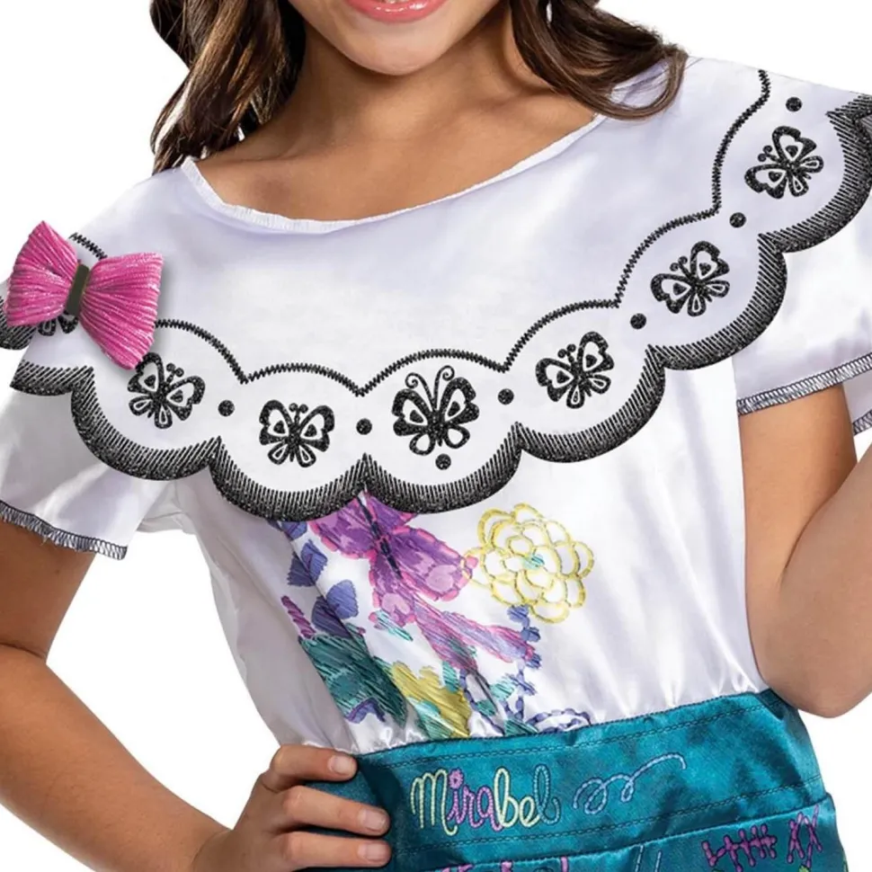 Ce déguisement est composé d’une robe avec un haut blanc à manches courtes avec un col bateau, qui habille les épaules. Le haut est orné de motifs de papillons et de fleurs. Un nœud rose est cousu sur un des deux épaules du haut. La jupe est longue évasée, de couleur turquoise avec une bordure bleue à dentelle et des imprimés de motifs de fleurs, d’animaux, de papillons et du nom « Los Madrigal ». Au niveau de la ceinture de la jupe, est également imprimé le prénom « Mirabel » en lettres roses et jaunes.