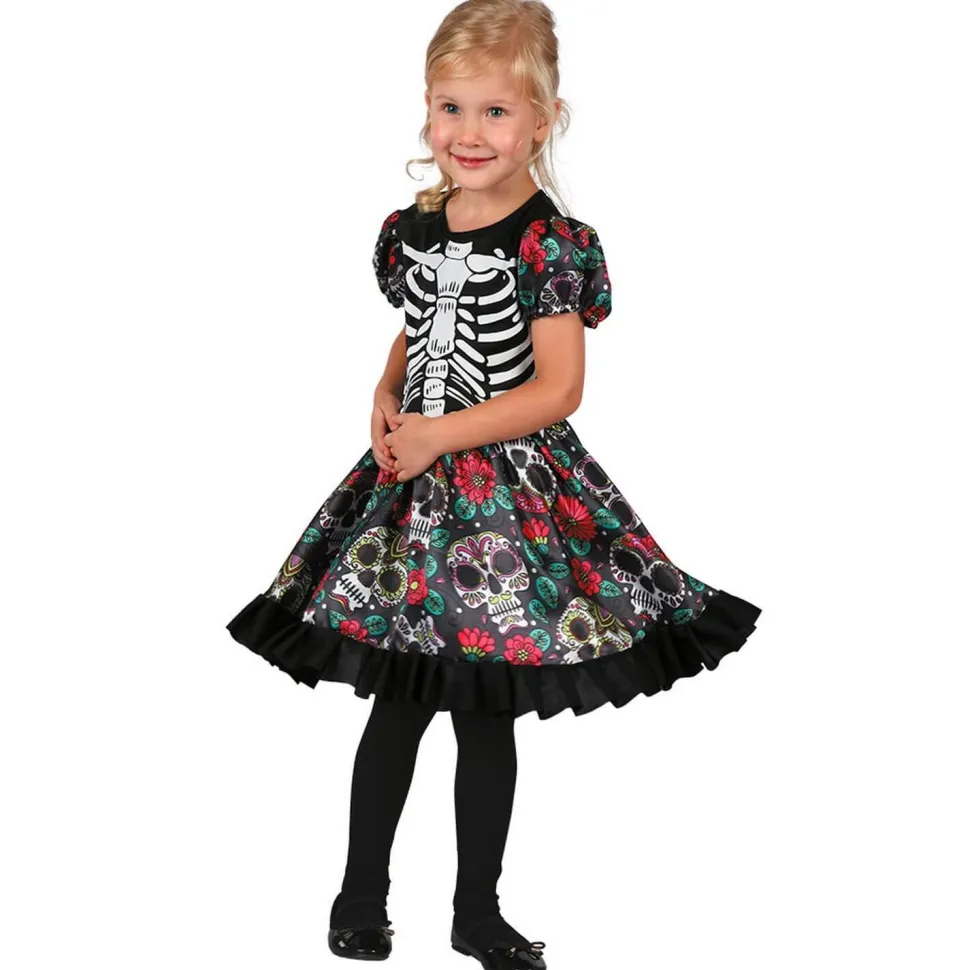 Ce déguisement se compose d’une robe à manches courtes. Le bustier de la robe est noir avec un dessin de squelette. Les manches sont bouffantes avec un tissu noir. Le tissu présente des motifs de fleurs rouges et des calaveras (têtes de morts mexicaines) colorées. On retrouve ce même motif sur le jupon de la robe. Le bas de la robe possède un volant froncé noir.