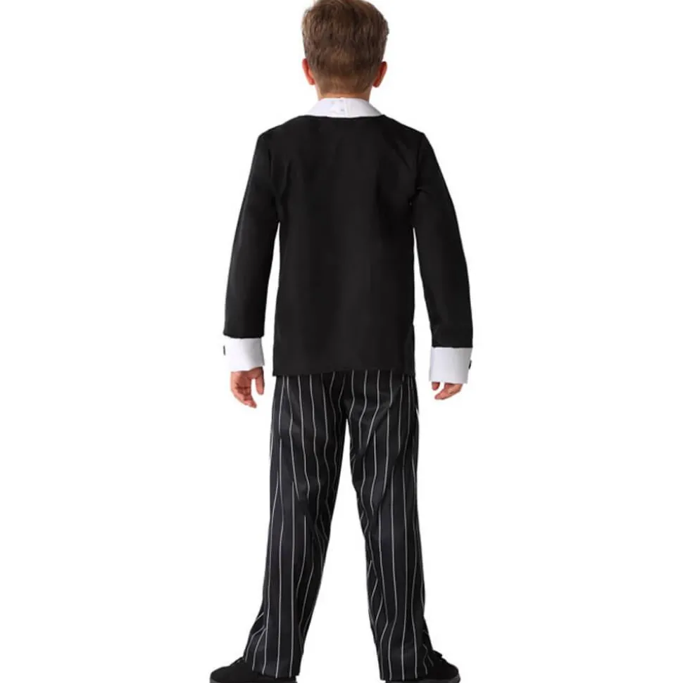 Ce déguisement comprend une veste à manches longues noire et grise, un pantalon noir à rayures fines et un noeud papillon rouge à pois noirs.