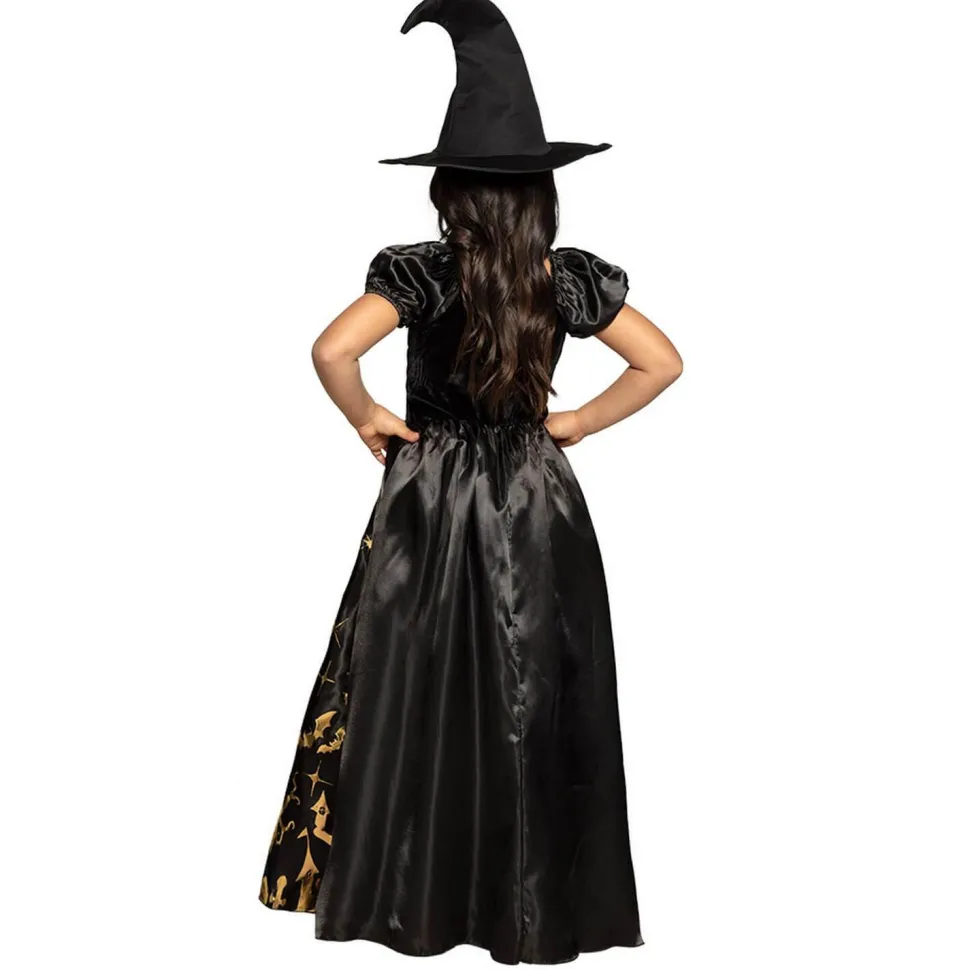 Ce déguisement se compose d’une longue robe noire à manches courtes. Le bustier de la robe à un effet corsage avec des détails dorés. Les manches sont bouffantes. Le jupon de la robe est noir satiné. Il y a des motifs de village de sorcière couleur or : des chauves-souris, des arbres, une maisonnette, des sorcières, des étoiles… Le déguisement vient avec un chapeau noir pointu. Il est légèrement tordu.