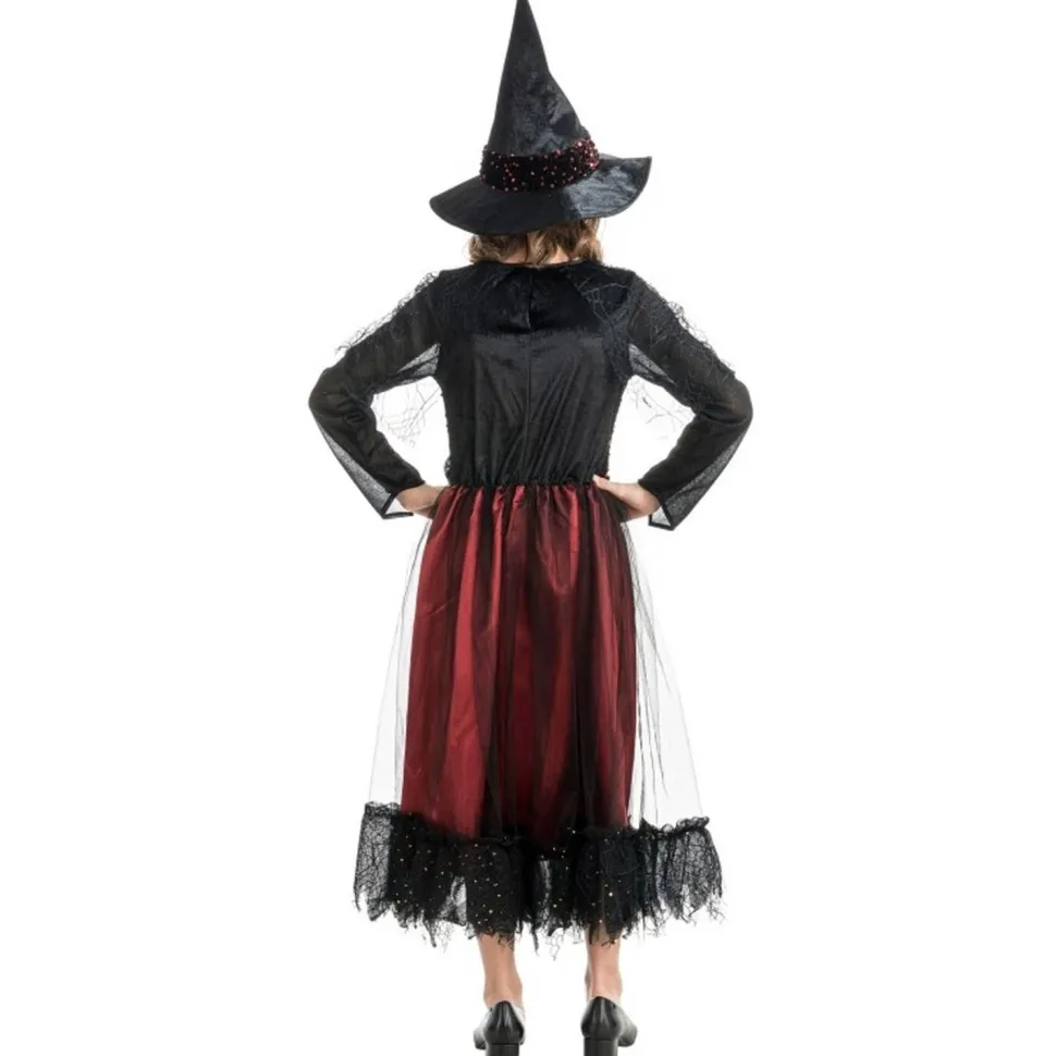 Déguisement Sorcière Lucinda Bordeaux à sequins colorés, comprenant la robe complète et le chapeau