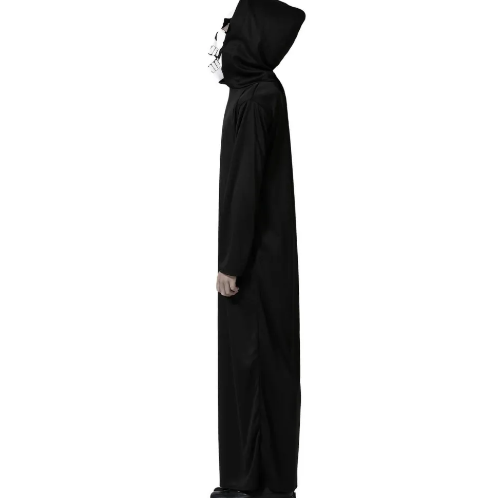 Cette tunique squelette est noire avec une capuche et un masque intégré.
