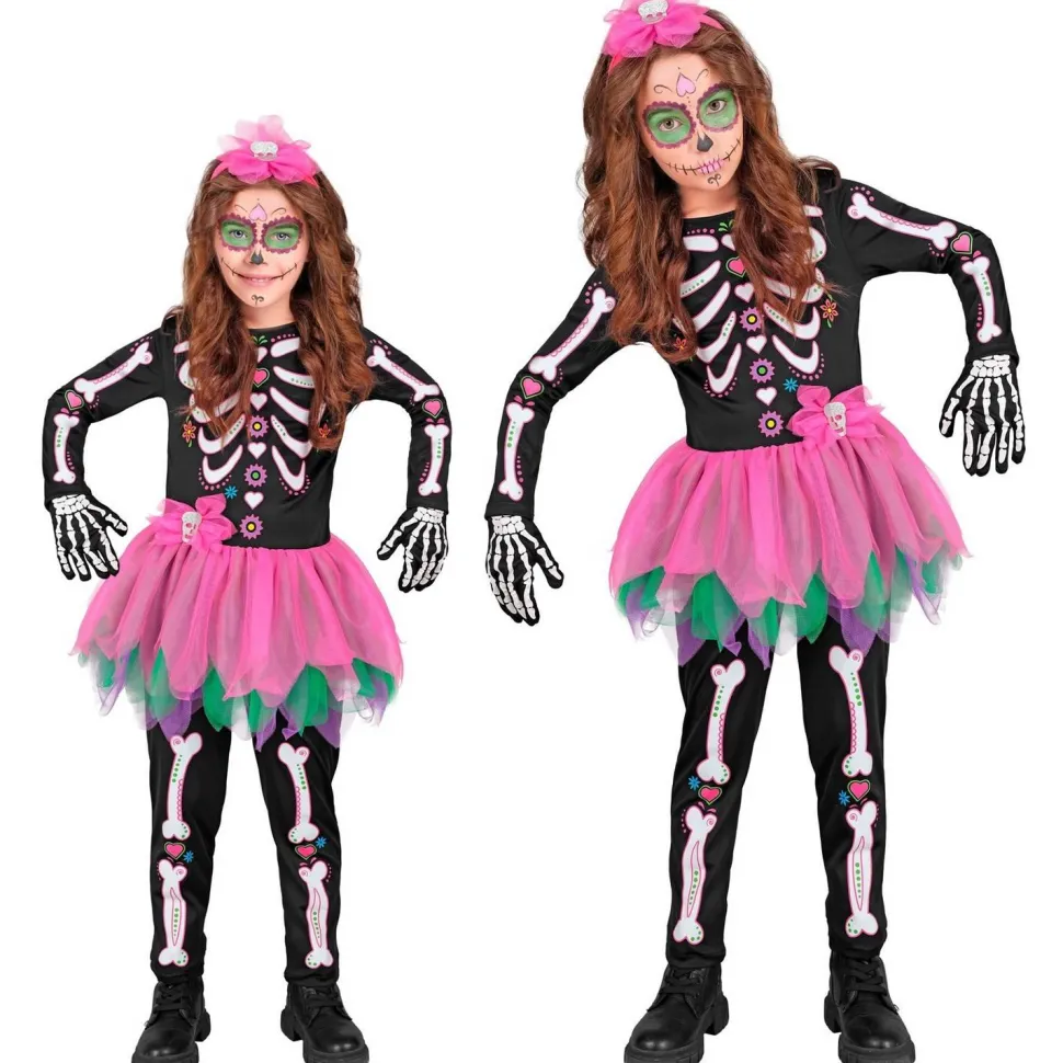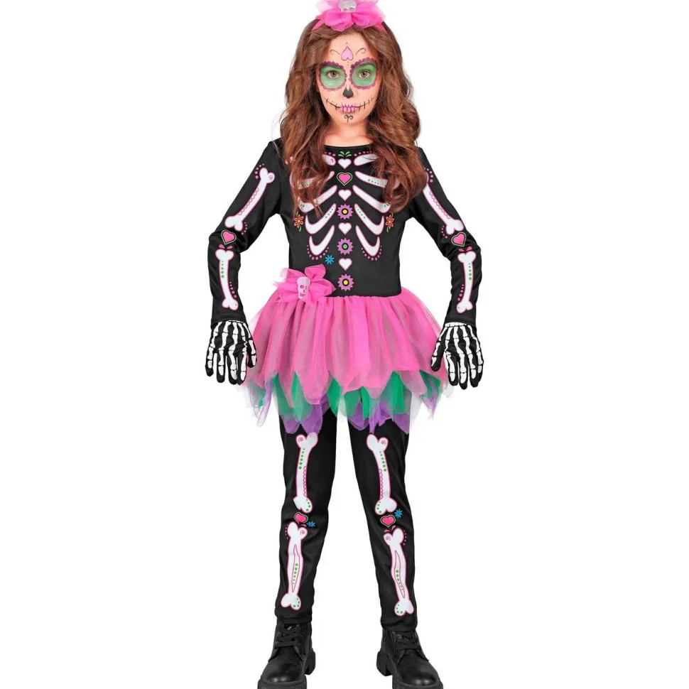 Avec son imprimé d’os stylisés en rose et blanc sur fond noir, agrémenté de motifs fleuris façon Dia de los Muertos, ce costume sort du lot. Le haut et le pantalon assortis forment la base du squelette, tandis que la jupe en tulle multicolore apporte une touche fun et festive. Les gants squelette complètent l’ensemble pour un effet ossement garanti, et le serre-tête à fleur vient couronner le tout avec une pointe de magie mexicaine.