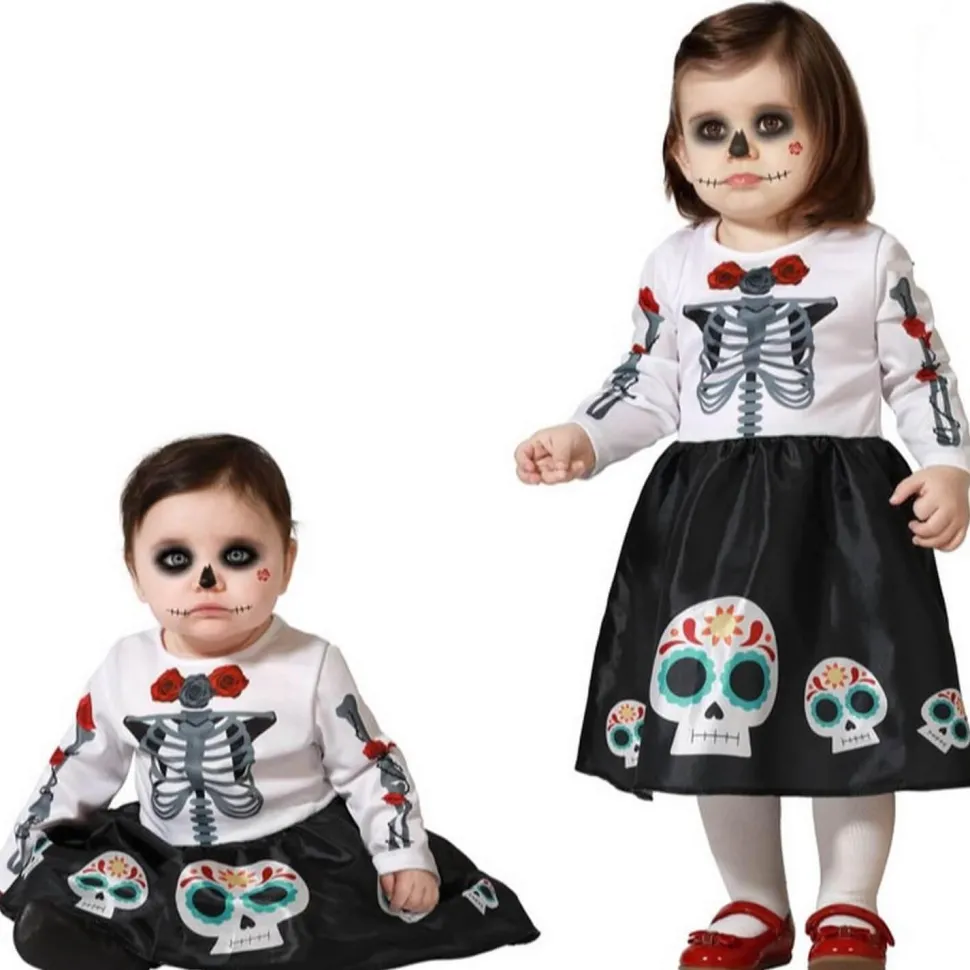 Ce déguisement pour bébé est une robe blanche et noire. Le haut de la robe est noire avec un squelette gris ainsi que des roses rouges. Le bas de la robe qui représente la jupe est de couleur noire avec des têtes de mort dia de los muertos sur le devant de la robe. Ce déguisement est à manches longues.