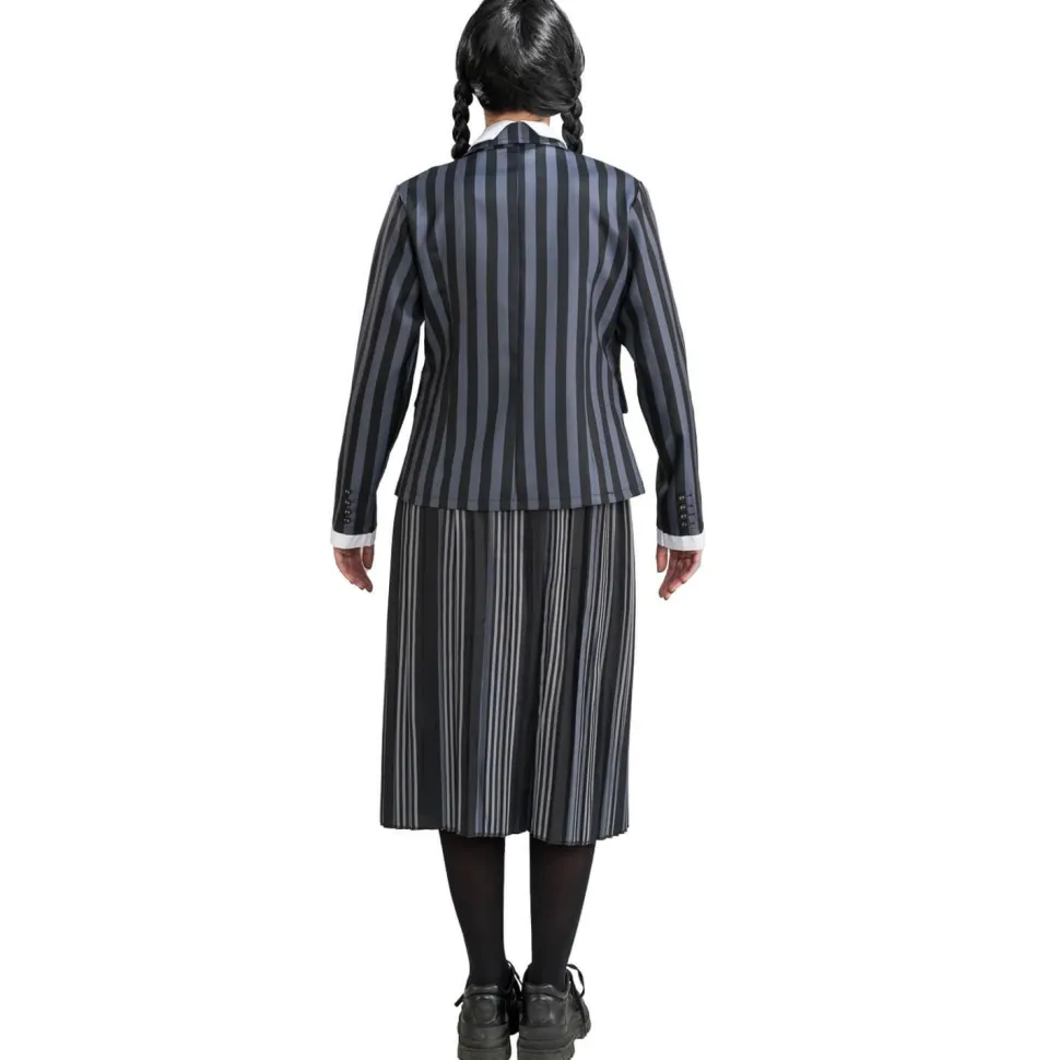Ce déguisement est fidèle à celui sur Netflix : il est composé d’une veste, d’une jupe et d’un plastron avec cravate gris et noires, et sur la poitrine se trouve l’emblème de l’académie. Ce déguisement est parfait pour Halloween ou un carnaval. Vous pourrez vous vanter d’incarnez un personnage aussi connu et fascinant !
