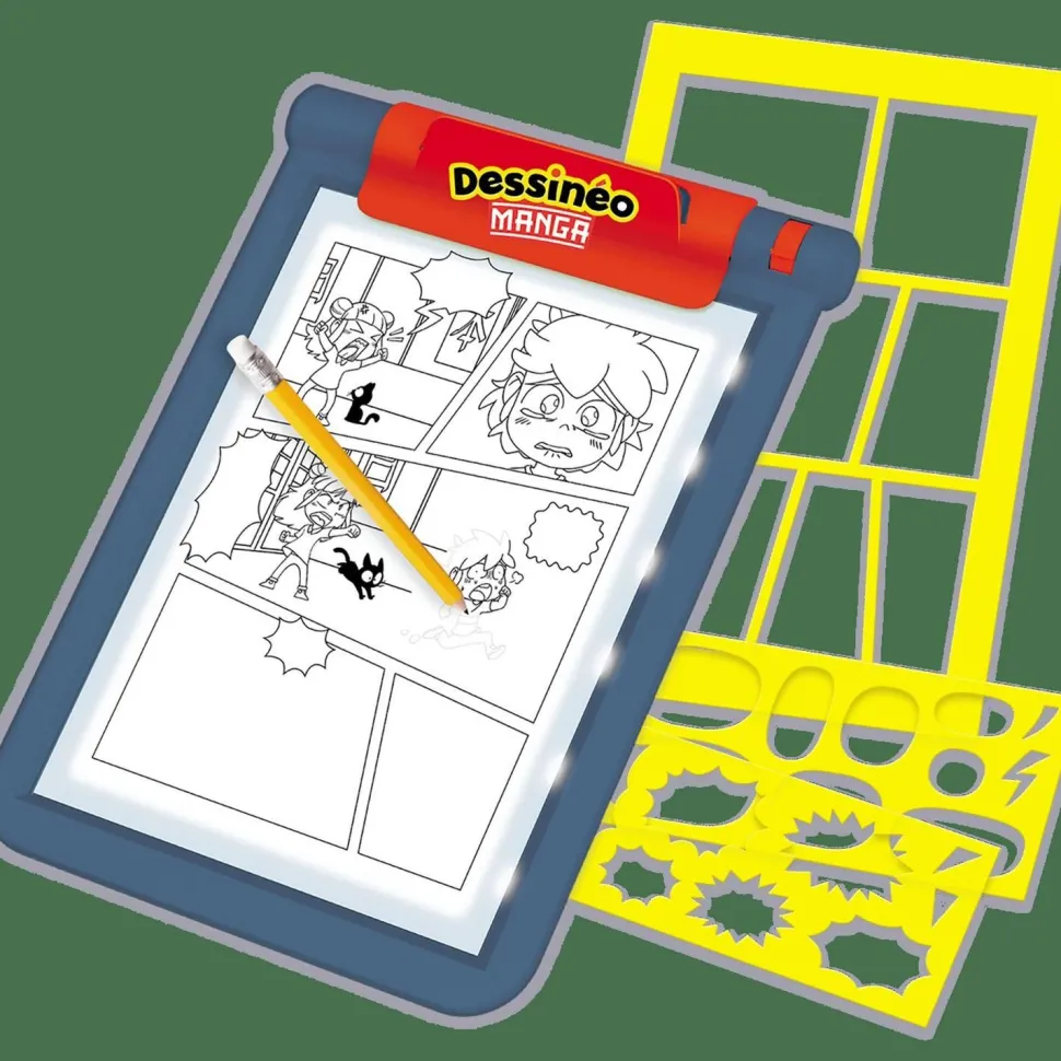 Contenu : Une tablette lumineuse pour feuilles A4 avec pince de fixation et zone de rangement au dos, Pochoirs « bulles », Pochoirs « cases », Planches de modèles et un guide du dessinateur de mangas