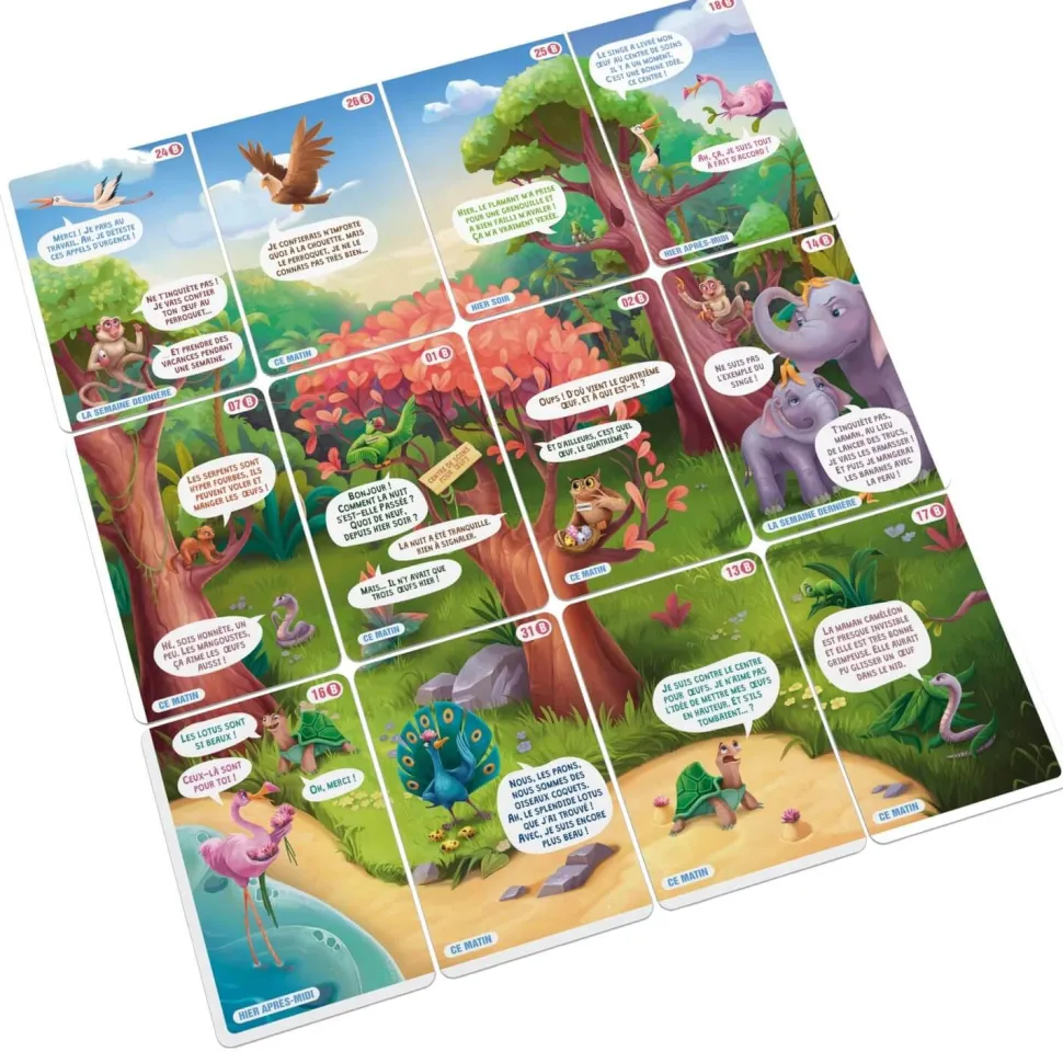 Soyez attentif aux détails ! Parlez aux animaux de la jungle et découvrez ce qu’ils savent ! Attention aux fausses pistes, vous devez décider quelles cartes peuvent vous aider à résoudre l’affaire de l’œuf en trop. Les joueurs choisissent les cartes et les assemblent pour dresser un tableau complet de ce qui est arrivé. Vous devrez répondre à quelques questions et décrire ce qui s’est passé et pourquoi.