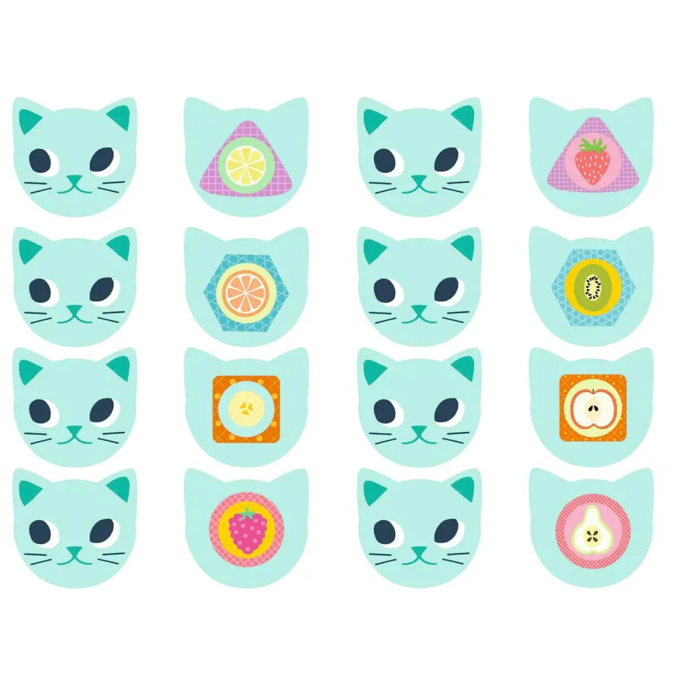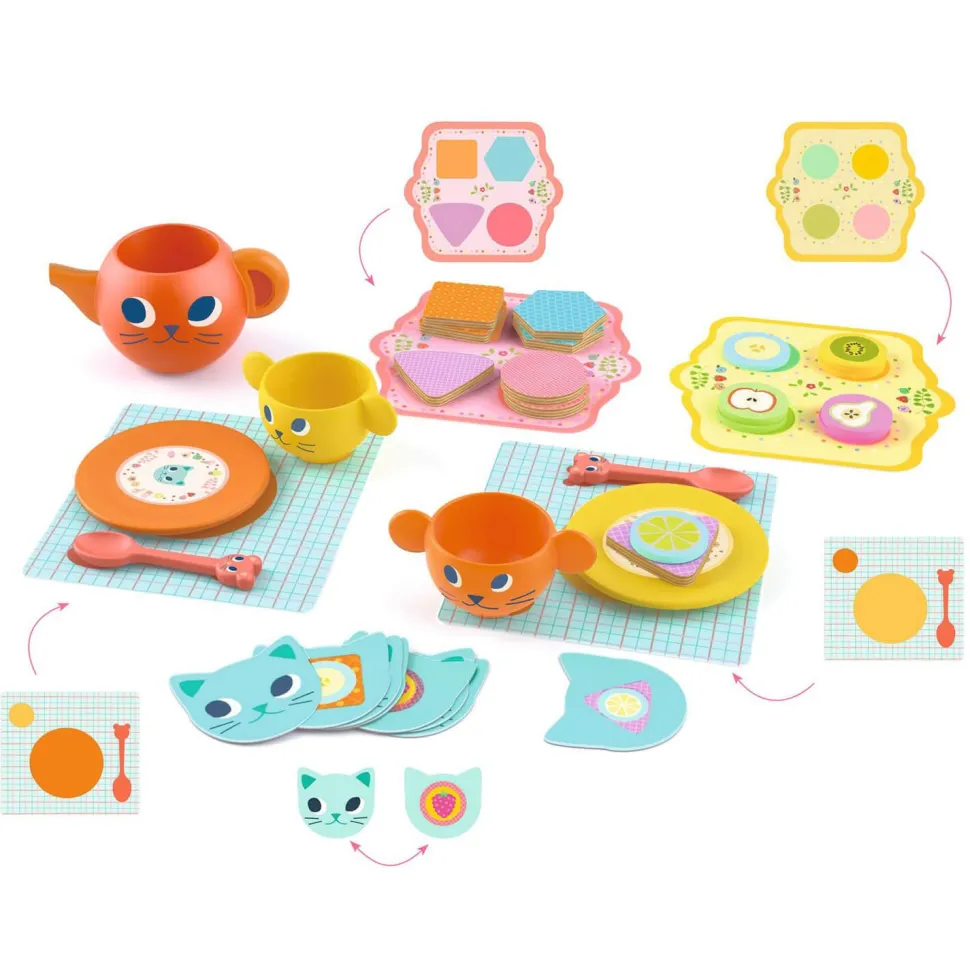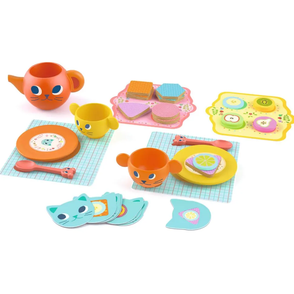 Contenu : 35 pièces : 4 sets de table, 2 tasses, 1 théière, 2 petites cuillères, 2 assiettes en bois, 8 biscuits illustrés, 8 pièces de feutrine, 8 cartes modèles « chat ».
