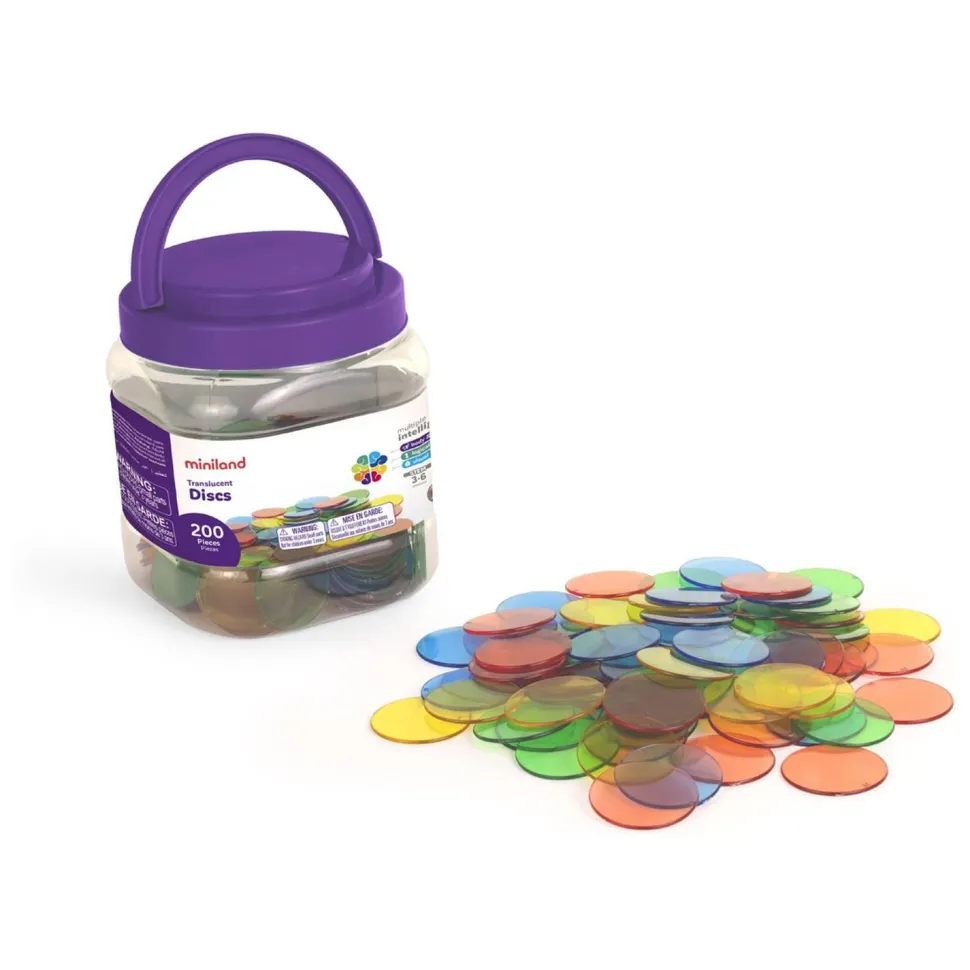 Set de 400 disques translucides en plastique de la marque Miniland pour jouer, apprendre à compter et à trier. Ces jetons translucides de différentes couleurs sont compatibles avec le Lightpad. Dimensions : 4cm de diamètre. Convient aux enfants de 3 à 6 ans.