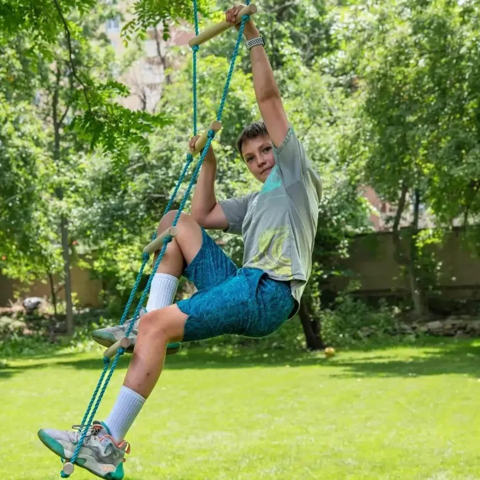 Cette échelle en corde de plus de 2 mètres est fabriquée à partir de chevilles en bois de haute qualité et d’une corde en nylon antidérapante et résistante. Attachez-la à une branche d’arbre ou aux lignes Trelins Nina et Swingset. Cette échelle de corde est faite de corde en nylon durable et résistante à l’usure. Peut supporter jusqu’à 227kg.