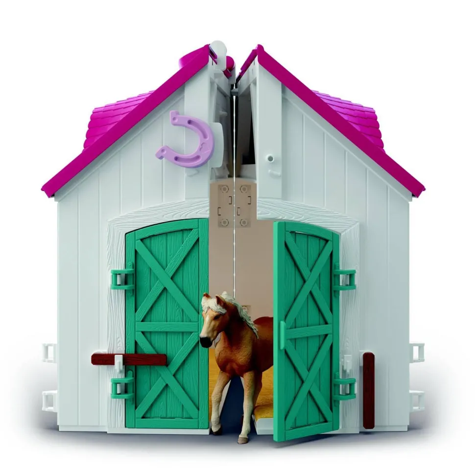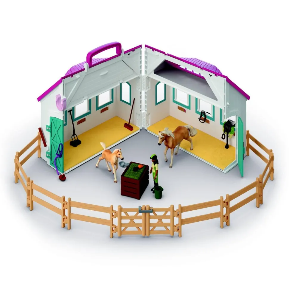 Contenu : 1 bâtiment écurie transportable, 1 Jument Haflinger, 1 Poulain Haflinger, 1 bride avec rênes, 1 selle, 1 licol rose, 1 longe rose, 1 tapis de selle, 1 figurine Sarah, 1 casque, 1 bracelet, 2 éléments de foin, 2 cadres de porte, 2 panneaux de porte, 2 fermetures de porte, 10 éléments de paddock, 1 verrou de porte de paddock, 1 fermeture fer à cheval, 1 râtelier, 1 fourche, 1 seau, 1 balai, 2 balles de foin, 1 portion de foin à enfourcher, 1 peigne, 1 abreuvoir, 1 botte de carottes, 2 lucarnes, 1 planche d’autocollants, 1 notice de montage