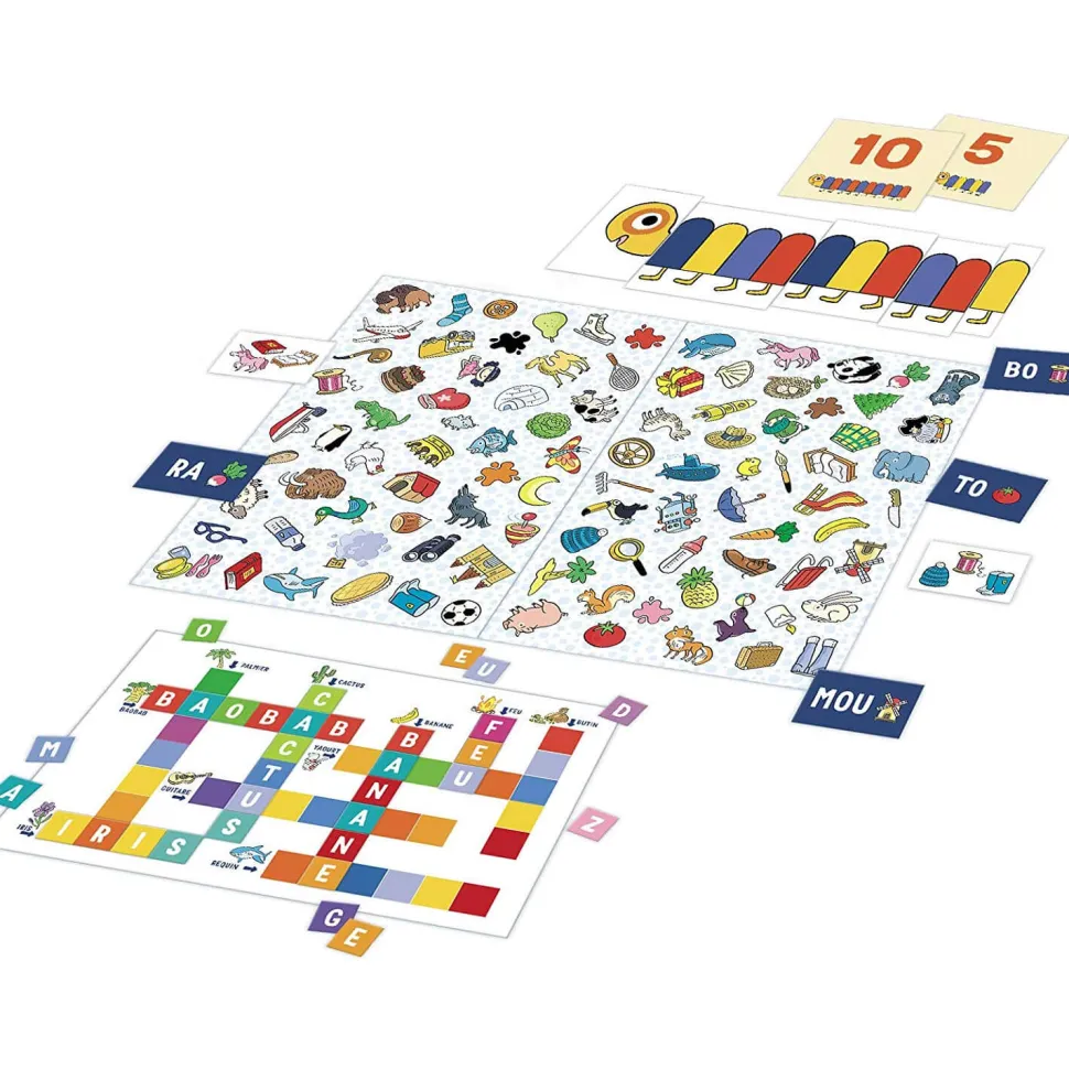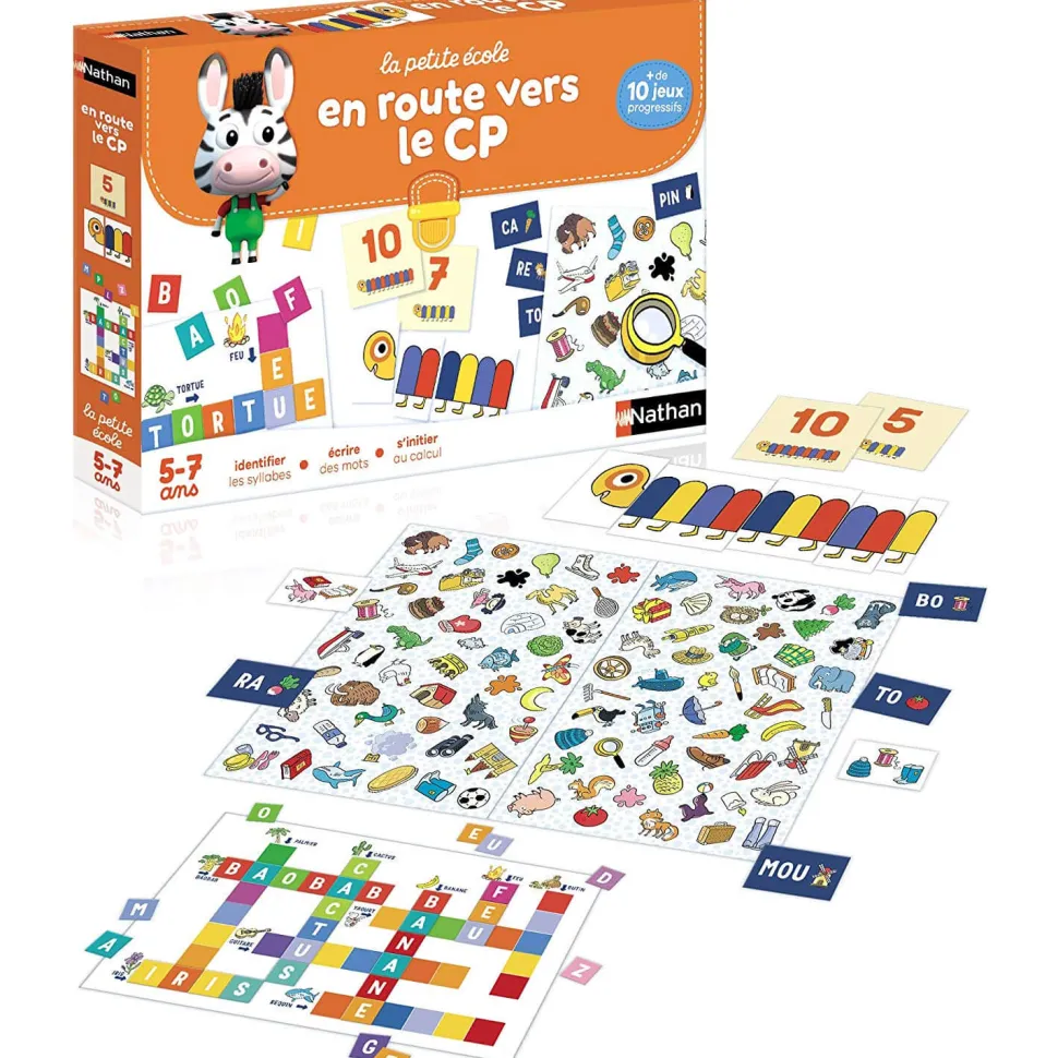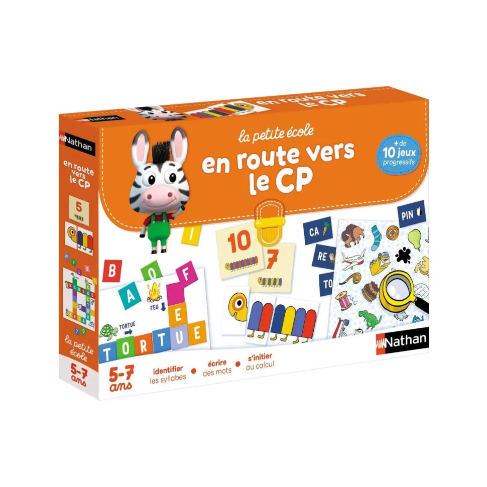 Un coffret pour préparer son entrée en CP avec sérénité et tout en s’amusant !Le primaire et d’autant plus le CP est une étape importante dans le parcours scolaire de l’enfant. Aussi, la marque Nathan avec ce coffret « En route vers le CP » propose d’aborder l’arrivée en CP à travers 10 jeux progressifs aux objectifs très clairs. Parmi ces jeux, vous trouverez le jeu de mots croisés ou le jeu du mille-pattes. Ces jeux vont aider l’enfant dans son apprentissage notamment pour identifier les syllabes, écrire les mots, et s’initier au calcul. Il est possible de jouer seul et d’apprendre à jouer à plusieurs.Contenu :- 1 plateau de jeu en deux parties recto-verso (jeu des syllabes / mots-croisés), – 36 jetons syllabes, – 12 cartes nombres mille-pattes, – 44 cartes quantités mille-pattes, – 96 jetons lettres de l’alphabet,- 1 guide de jeu.