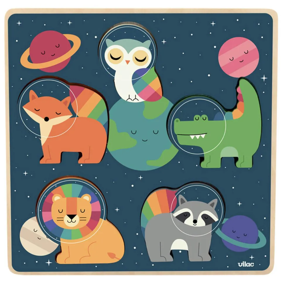 Vilac a conçu ce jeu d’encastrement en bois avec 5 pièces en forme d’adorables animaux dans l’espace pour les petits dès 18 mois