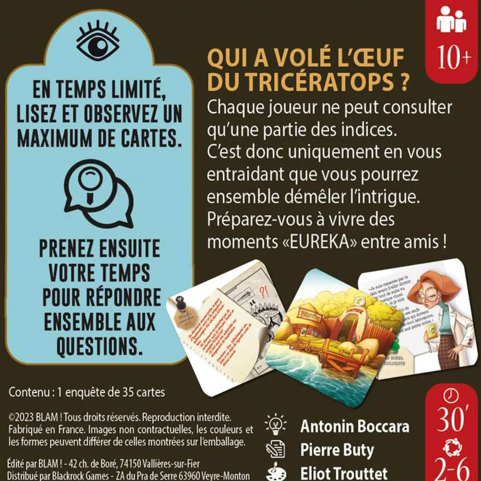 Votre équipe d’enquêteurs devra faire preuve d’une coordination sans faille pour résoudre ce cas inhabituel. Chaque joueur détient des indices clés, mais seul le partage astucieux de ces informations permettra de reconstituer le puzzle et de découvrir le coupable. Soyez prêts à utiliser toutes vos compétences en matière d’investigation, car le temps joue contre vous.