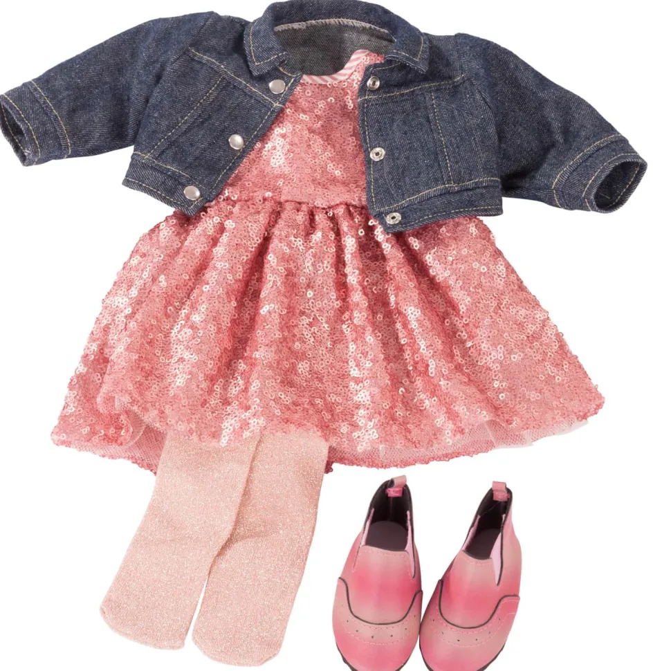 Cet ensemble est composé d’une robe Glitter à sequins roses, d’une veste imitation jean, d’une paire de collants brillants rose pâle et d’une jolie paire de chaussures assorties. Avec cette tenue, votre poupée sera la plus jolie pour sortir !