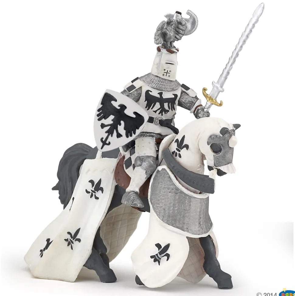 Paré à l’attaque avec cette figurine Chevalier blanc au cimier !Les figurines Papo vous permettent d’entrer dans un autre monde : celui de l’imaginaire. Avec les nombreuses figurines qu’il a créées, vous pouvez vous inventer une multitude d’histoires sur de nombreux thèmes.Que ce soit pour tuer un dragon, pour partir en guerre pour le pays, pour sauver une demoiselle en détresse ou pour participer à une joute de chevalier, cette figurine est parfaite !Habillé d’une tenue de chevalier, il est paré à l’attaque. Il est vêtu d’un pantalon, d’une tunique et d’un casque de la même couleur : le blanc. Il porte également des protections en cotte de mailles, de couleur argentée. Sur son heaume se trouve un cimier : un aigle. Il est également très armé : une longue lance dans sa main droite, un bouclier blanc décoré d’un aigle noir (présent aussi sur sa tunique) dans sa main gauche, une hache accrochée dans son dos et un couteau accroché à sa ceinture.Dimensions de la figurine (L x l x H) : 5.5 x 6 x 10 cm.Note : le cheval est vendu séparément, sous la référence Papo-39786.
