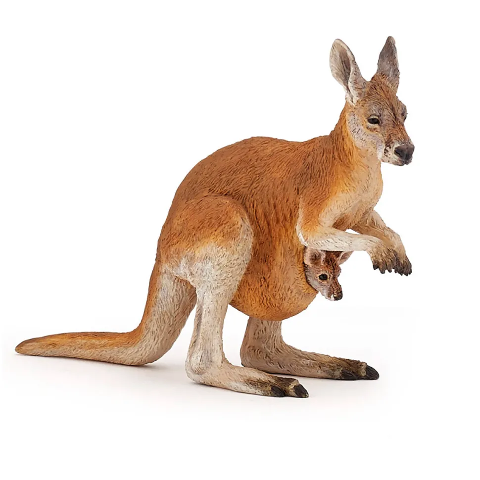 Une adorable figurine de kangourou avec son petit dans la poche ! Le kangourou est un marsupial, au même titre que le koala ou l’opposum de Virginie. Il existe pas moins de 63 espèces (sans compter les proches cousins comme les wallaroos ou les wallabys). Le kagourou ne se trouve à l’état sauvage que sur le continent australien et sur l’île voisine de Tasmanie. On estime leur nombre total à environ quarante millions, soit la moitié de la population française ! Comme toutes les figurines de la marque Papo, ce kangourou est peint à la main et reproduit fidèlement son modèle, aussi bien dans sa morphologie que dans sa posture. Dimensions de la figurine : L11 x l3 x H7.5 cm.