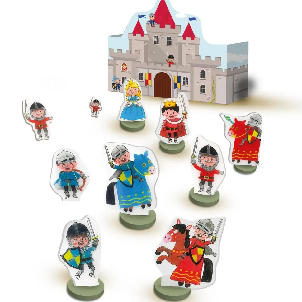 Découvre la magie du film rétractable ! Ce kit comprend tout le nécessaire pour confectionner ton propre château et même des chevaliers. Trace les exemples, colorie-les et place-les dans un four chaud. Waouh ! Regarde comme tes créations rétrécissent vite. Elles sont prêtes ? Alors mets toutes tes créations dans les supports en mousse inclus, mais où est le château ? Tu peux facilement le découper dans l’emballage.