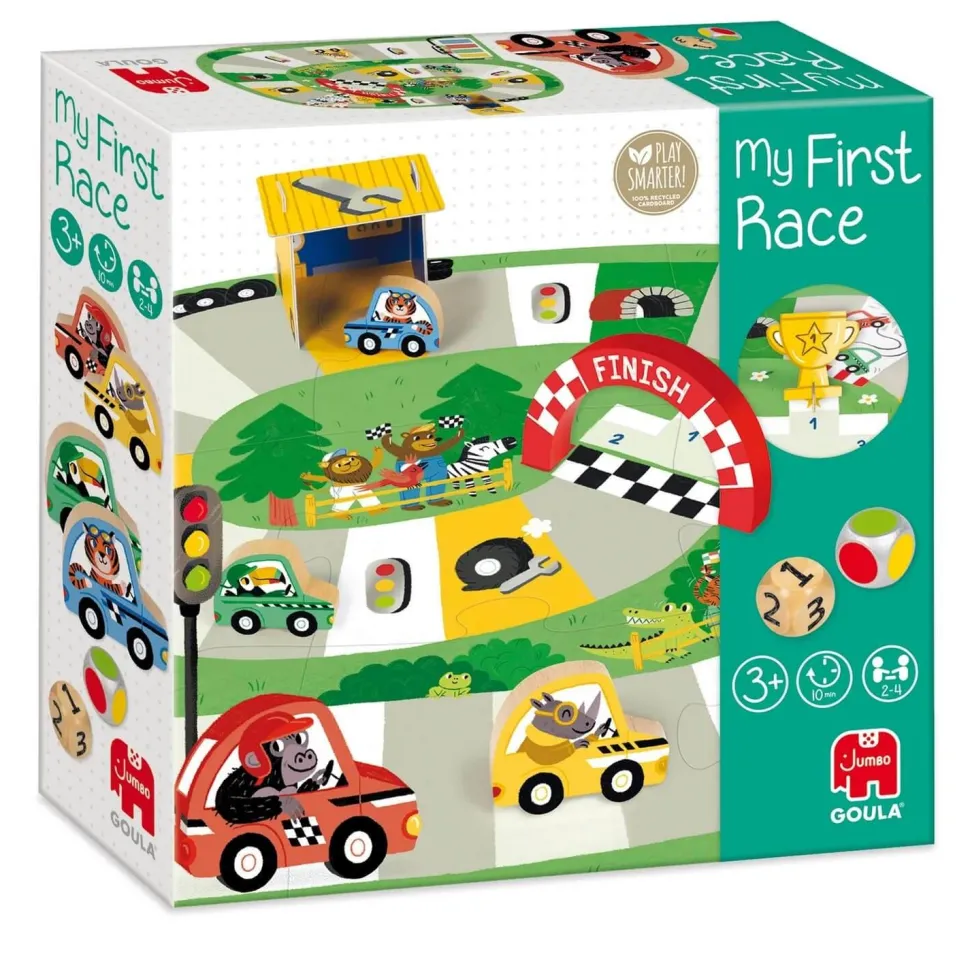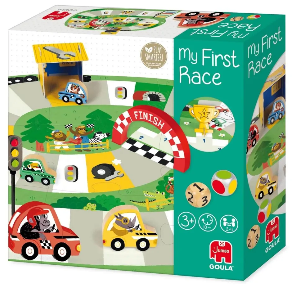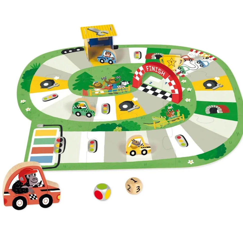 Un premier jeu de course de voitures. Chacun leur tour, les joueurs lancent le dé et avancent leur voiture du nombre de case correspondant à la valeur du dé. Le joueur qui fait arriver sa voiture en premier sur la ligne d’arrivée gagne la partie. Mais attention aux cases spéciales qui pourront vous faire avancer ou reculer. Un premier jeu de société pour apprendre à attendre son tour, à faire rouler le dé et à faire l’action correspondante. Un joli jeu de parcours avec des voitures en bois conduites par des animaux rigolos.
