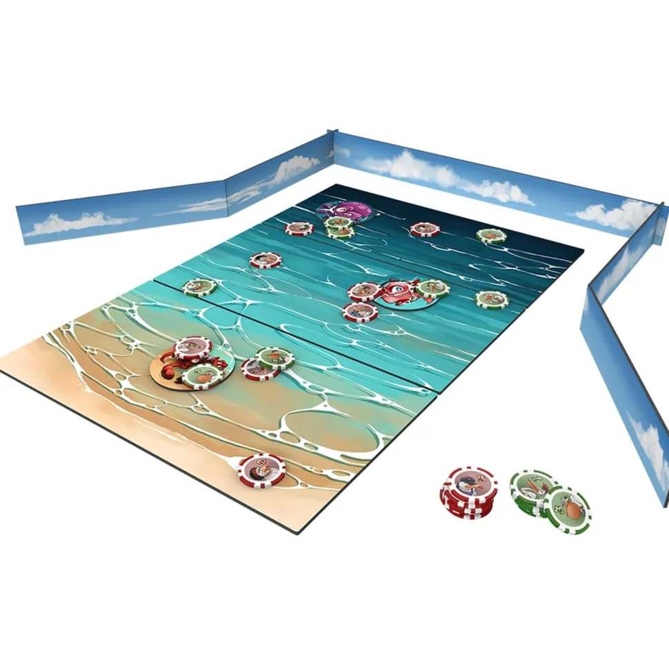 Chaque équipe dispose de 12 palets de valeur 1 à 3. À tour de rôle, ils en jettent un de leur choix en visant un poisson, une zone de la plage ou les palets adverses ! Une fois tous les palets lancés, on calcule la somme des valeurs des jetons sur chaque cible et sur chacune des trois zones de la plage. Les points sont attribués pour chaque à l’équipe majoritaire et la manche revient au plus grand total.