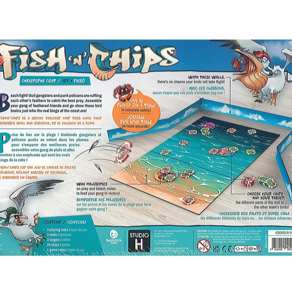 Dans Fish N’ Chips, les goélands et les pélicans, s’affrontent pour déterminer qui sont les meilleurs oiseaux marins pêcheurs. L’équipe d’oiseaux la plus habile et tacticienne gagnera la partie, la dextérité sera de mise.
