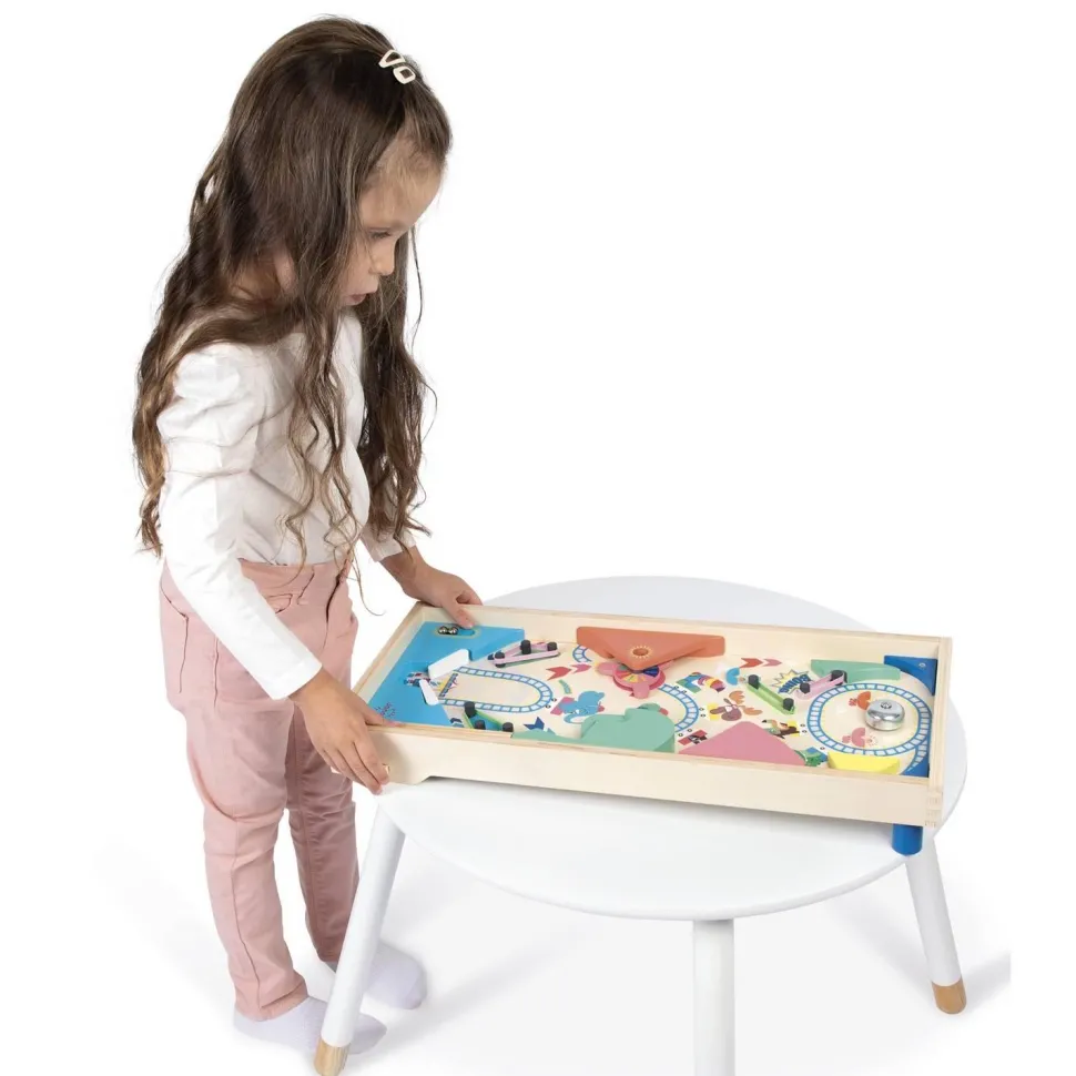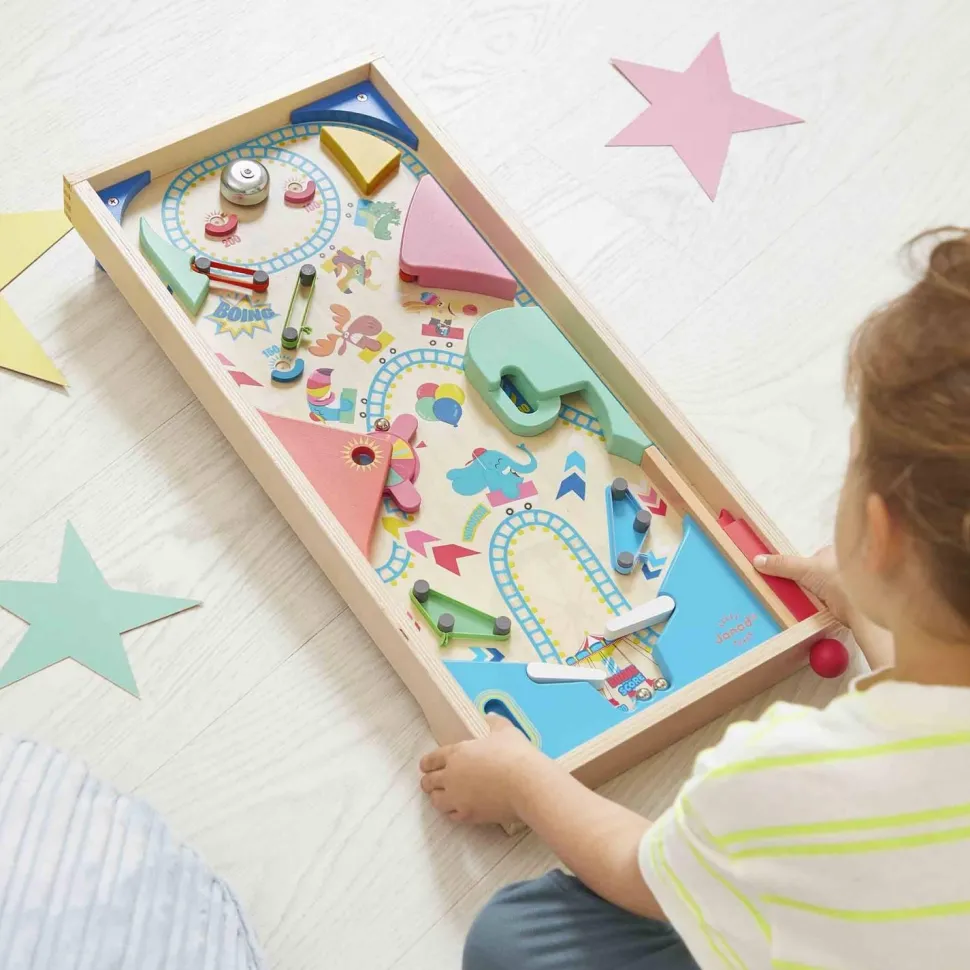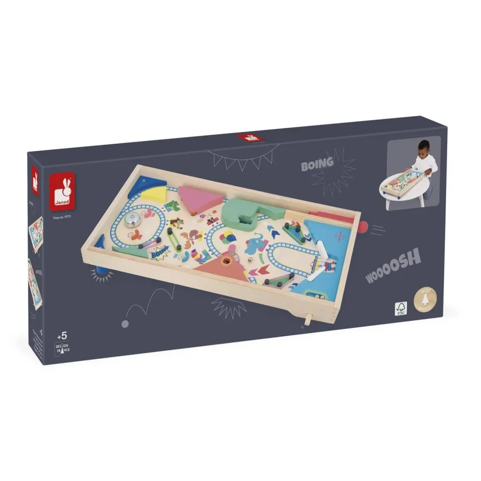 Un flipper de table est aussi un chouette moyen d’apprendre à additionner les points, pour tenter de battre son record personnel ! Sur le thème de la fête foraine, ce flipper jouet est livré avec 3 billes en métal. Sur le plateau en bois naturel, un grand-huit en folie donne le ton de la partie : un jeu festif, plein de rebondissements et de suspense, où l’on passe rapidement d’une émotion à l’autre ! 4 élastiques jouent le rôle de slingshots pour renvoyer la bille avec force, 1 roue permet de remporter toujours plus de points, et 1 cloche tout en haut peut être ciblée avec objectif de faire retentir le signal de la victoire ! Il y a aussi de nombreuses zones bonus pour accumuler des points supplémentaires, soit tout pour une partie de flipper endiablée !