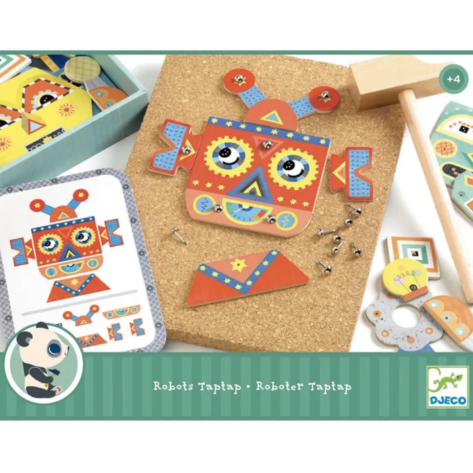 Découvrez Tap tap robots de Djeco, un jeu de construction pour créer toutes sortes de robots à l’aide d’un marteau et de clous.