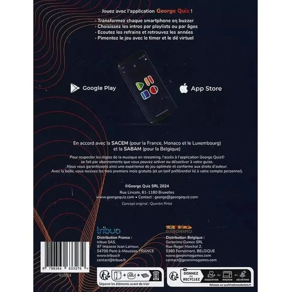 Découvrez George – Blind test de la marque Tribuo. Dans George : Le Blind-Test est un jeu d’ambiance pour vos soirées entre amis jusqu’à 24 joueurs. Dans ce jeu de quiz musical, testez votre mémoire et votre rapidité ! Transformez votre smartphone en buzzer, écoutez des refrains ou des intros et retrouvez les titres, interprètes ou années de célèbres tubes musicaux. Ce jeu est parfait pour animer vos soirées et faire deviner des morceaux iconiques à vos amis. La compétition est serrée, et il faudra être rapide pour répondre avant les autres ! Nécessite une application numérique (Apple ou Android) : gratuite pendant les 3 premiers mois.