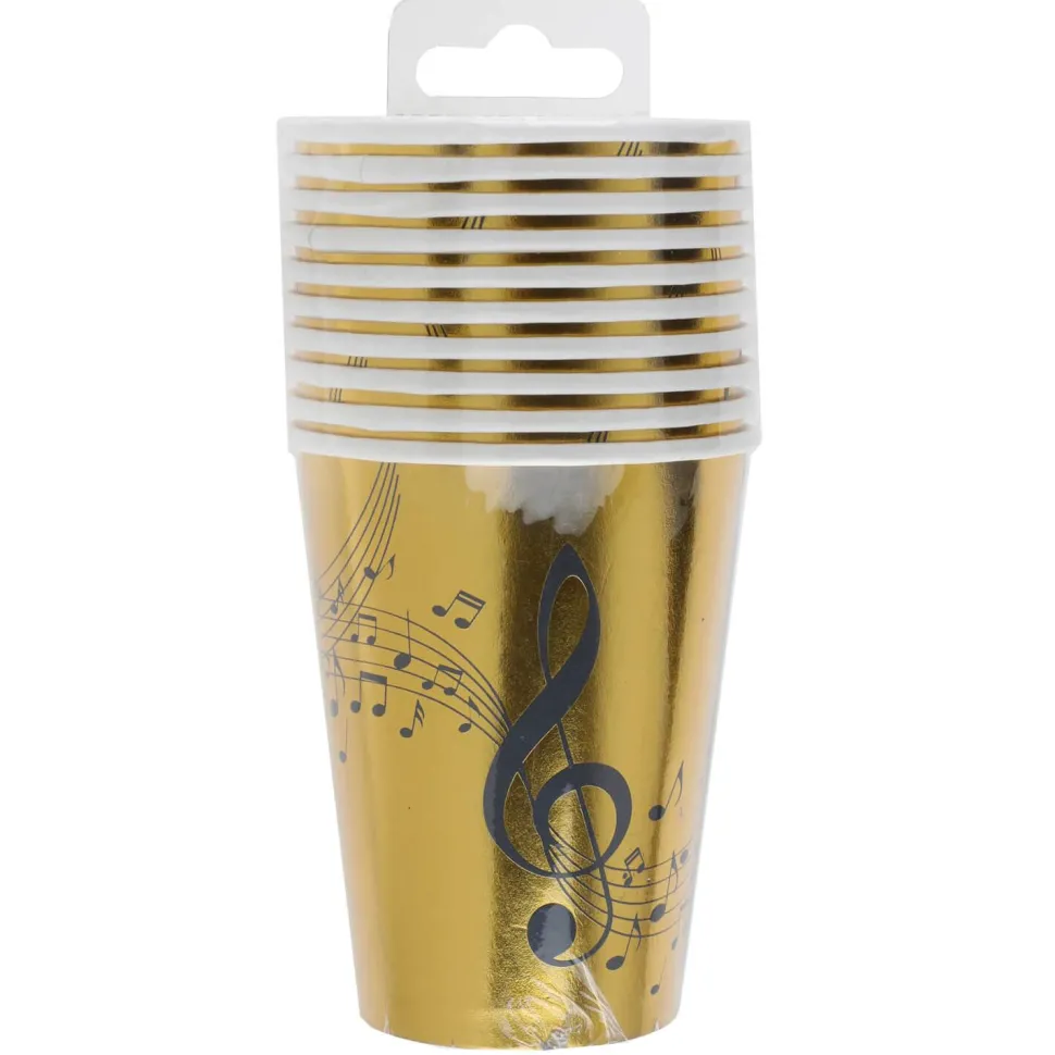 Les gobelets sont doré métallique avec une partition et des notes de musique noires.
