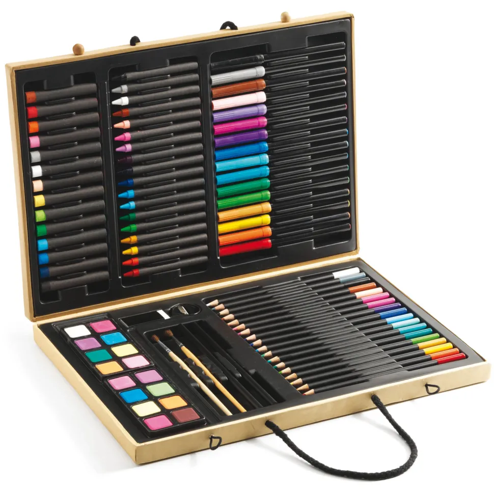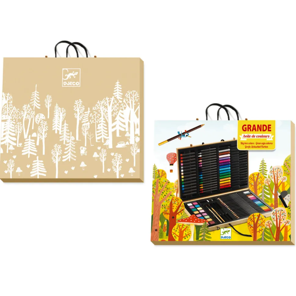 Voici LA boîte dont tous les artistes en herbe rêvent ! Ce coffret équipé de poignées va vous permettre de créer absolument partout. Il contient différents types de feutres et de crayons ainsi que des pastilles d’aquarelle pour varier les plaisirs et les rendus. Il ne vous manque que des feuilles de dessin vierges et … un brin d’inspiration ! Contenu de la boîte : – 18 crayons de couleurs- 16 feutres- 18 crayons de cire- 14 pastels gras- 8 pastilles d’aquarelle- 2 pinceaux- 2 crayons de papier- 1 taille crayon- 1 gommeLe coffret en carton présente un décor forestier à colorier, avec des arbres, des champignons, des escargots et des … girafes ! Choisissez vos couleurs selon votre envie pour obtenir un coffret vraiment unique ! Dimensions de la boîte : 36.5 x 26 x 4 cm.