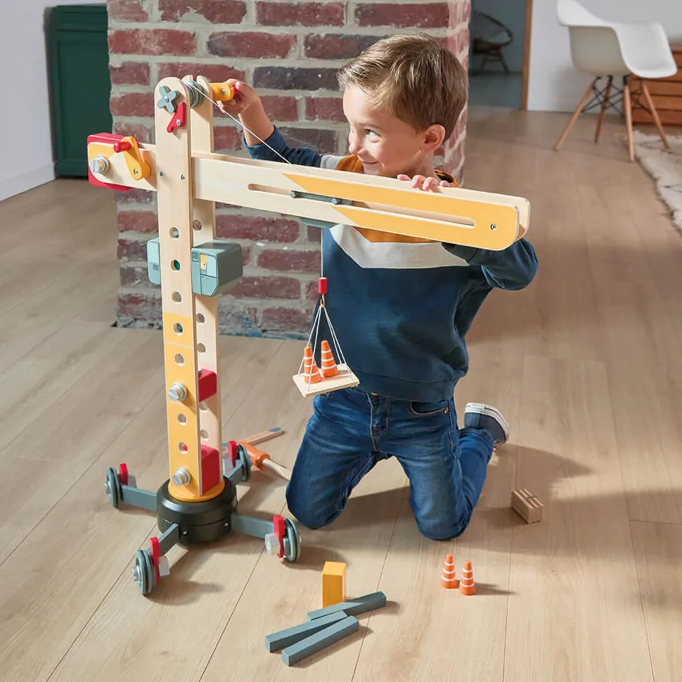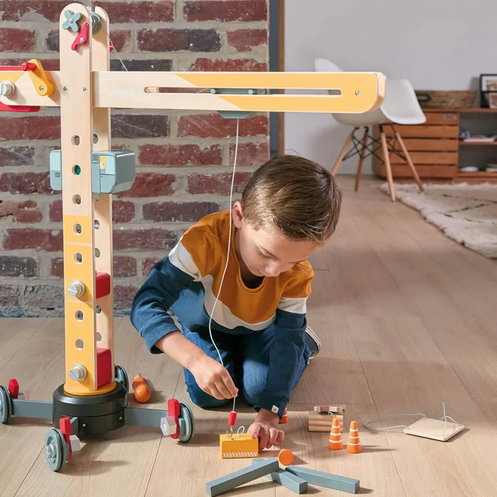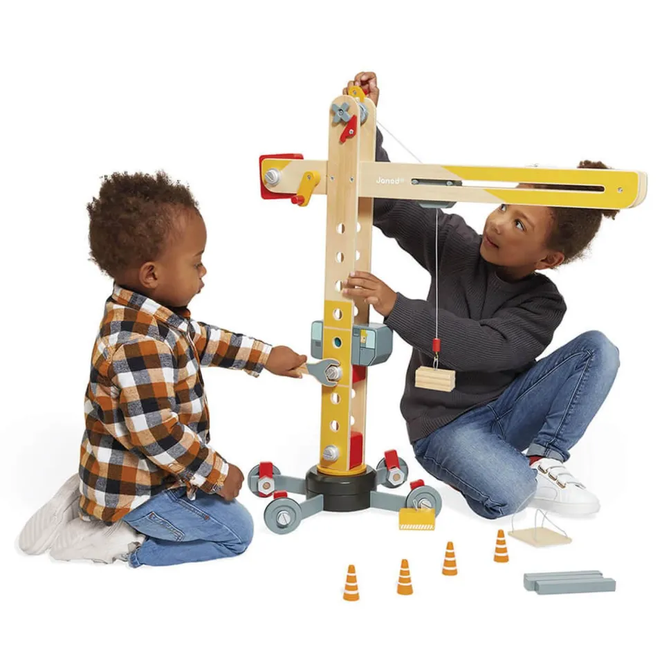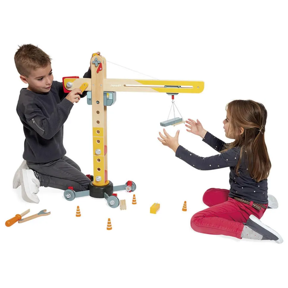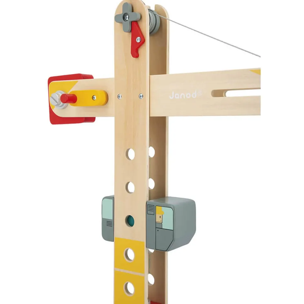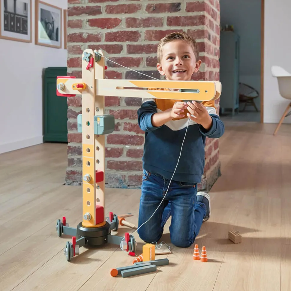 Grande Gru à assembler sur roues de la marque Janod idéale pour les petits bricoleurs dès 3 ans.