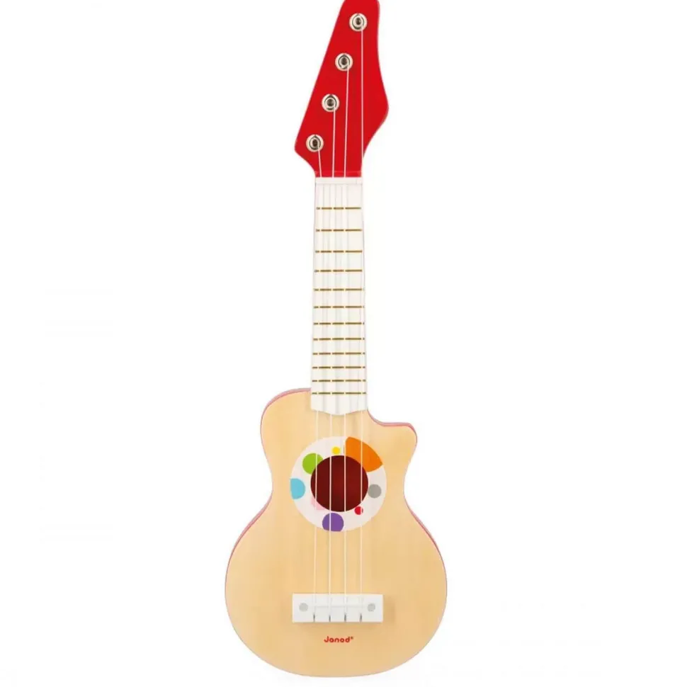 Branchez les guitares ! Si des petits rockeurs se déhanchent chez vous dès que les premiers accords de guitares se font entendre, voici un cadeau idéal qui leur permettra d’imiter les plus grandes rock stars en festival ! Cette magnifique guitare au style puissant va électriser les fans de musique ! Concerts et imitation garantis avec ce jouet musical en bois aux couleurs de notre gamme Confetti. Ses tons bois clair, réhaussés de pois multicolores et son manche rouge en font un instrument unique ! Equipée de 4 cordes, cette guitare jouet permettra aux enfants dès 3 ans de découvrir les sons et d’éveiller leur sens du rythme. Un set de cordes supplémentaire est ajouté, de quoi satisfaire tous les musiciens, même les plus dynamiques !
