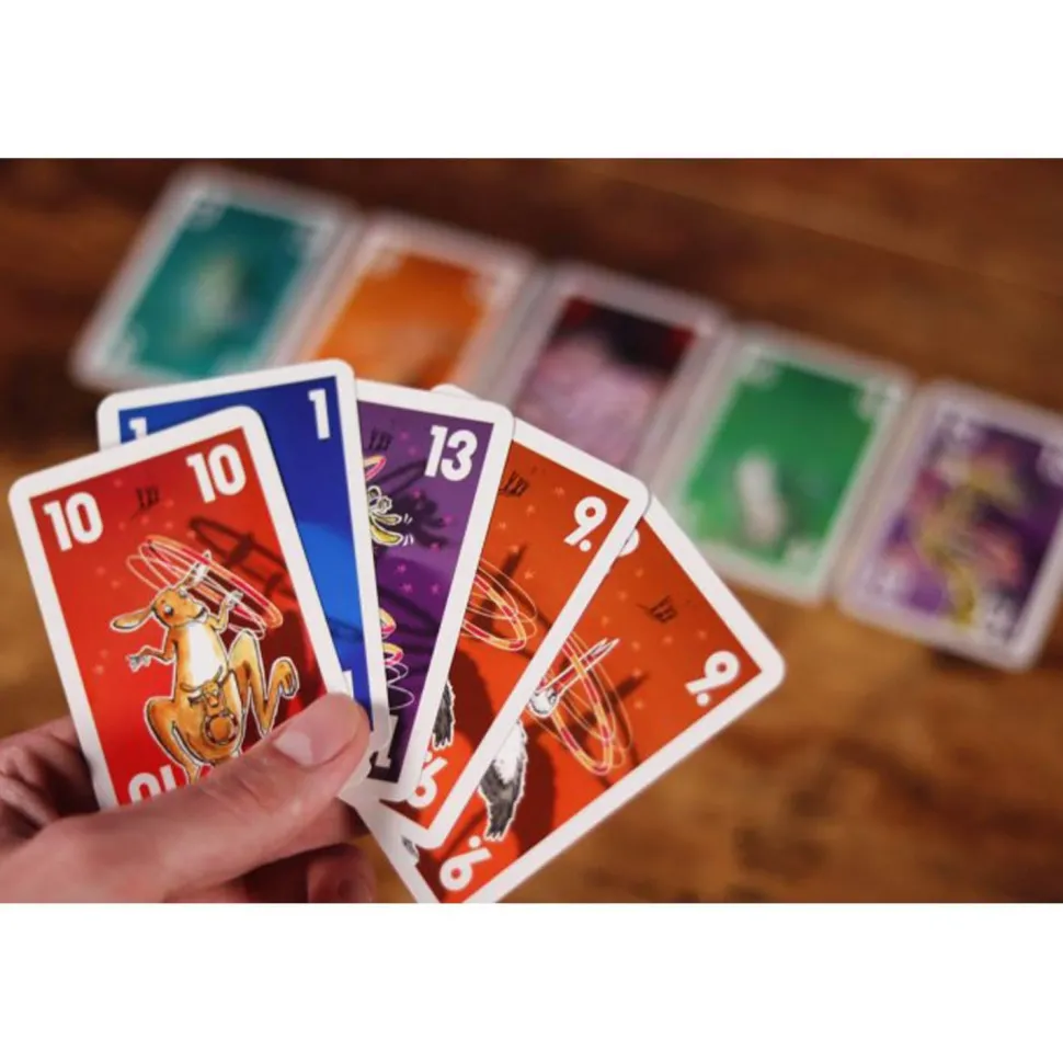Envie d’un jeu rapide et plein de surprises ? Hula Hoo ! vous met au défi de vider votre main et vos cartes ouvertes avant les autres, en jouant plus haut, plus bas… ou en doublant la mise ! À chaque tour, choisissez astucieusement la carte à poser, car ne pas pouvoir jouer vous élimine du tour. Entre stratégie, bluff et réactions rapides, préparez-vous à faire tomber les cerceaux… et vos adversaires ! Parfait pour des parties funs et dynamiques entre 2 et 6 joueurs.