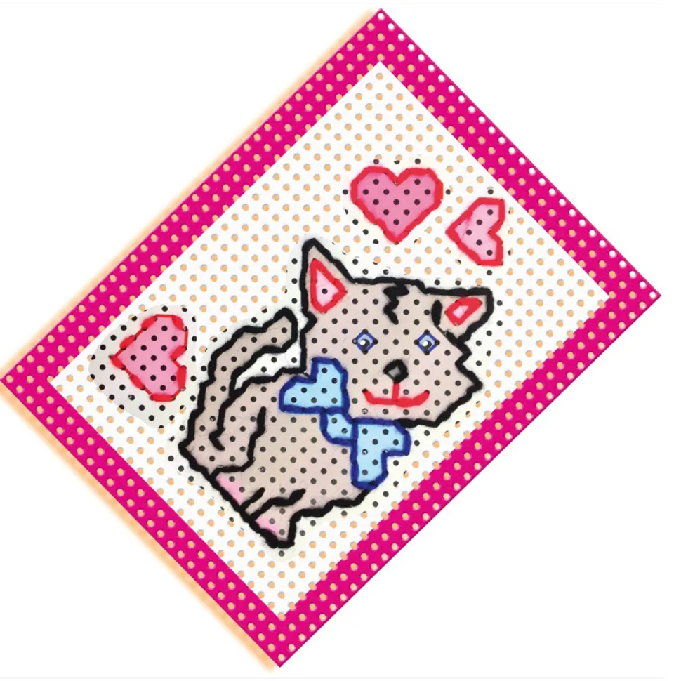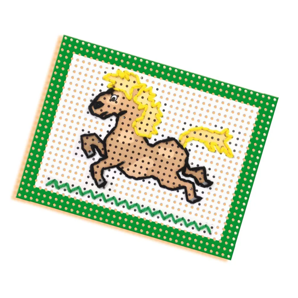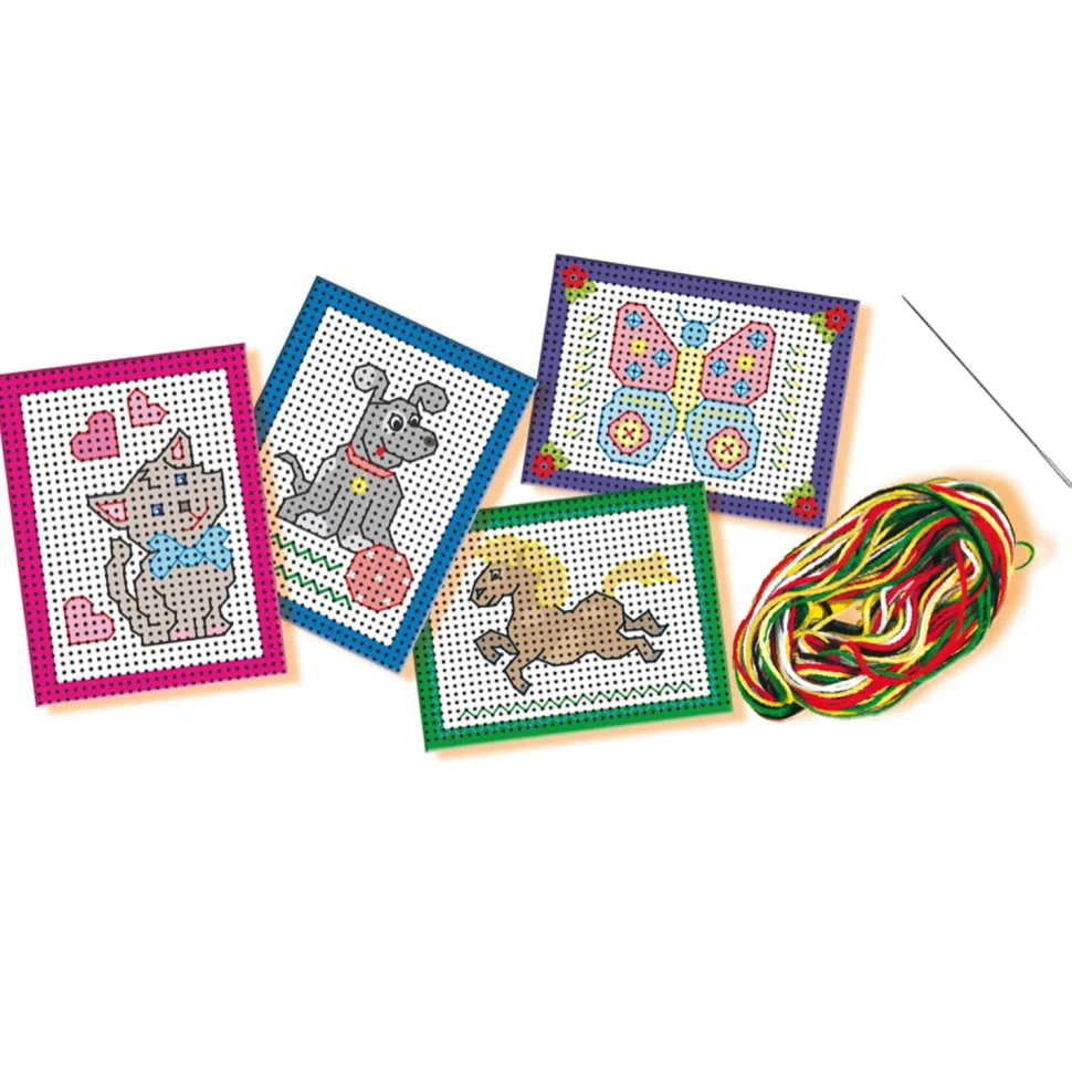 Avec ce kit « J’apprends à broder », se lancer dans la broderie est un vrai jeu d’enfant !Ce kit SES Créative destiné aux enfants de 3 à 6 ans permet d’acquérir de manière ludique des compétences créatives. IIl contient :- 4 cartes à broder préimprimées (perforées)- 1 aiguille – 1 dé à coudre – des fils : noir, rouge, bleu, jaune, vert.Avec le matériel fourni, vous pourrez dans un premier temps apprendre à utiliser une aiguille et un fil. Vous pourrez ensuite réaliser des figures en couleur sur les cartes à broder : Broder un chat, un papillon, un cheval et un chien. Les cartes sont préimprimées et perforées et sont donc plus faciles à broder, vous pourrez faire passer l’aiguille sans problème par les gros trous.La broderie se fait en toute sécurité grâce à une aiguille à bout rond.