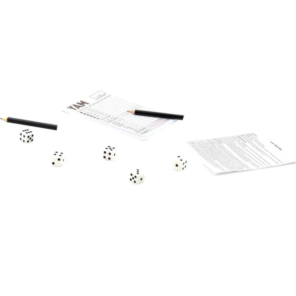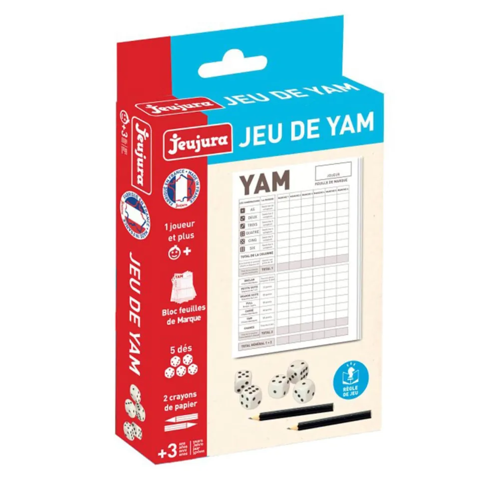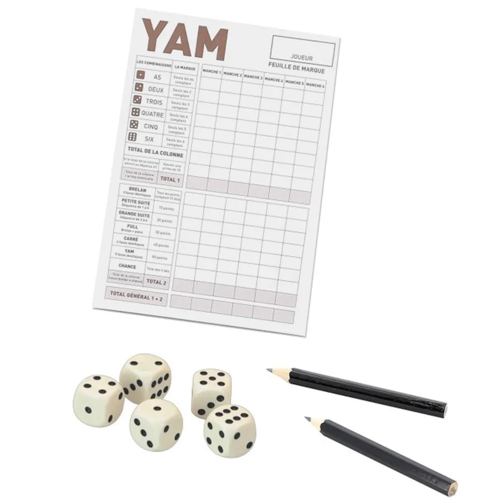 Le jeu de Yam est un jeu de hasard raisonné. Il faut réaliser, avec les 5 dés des combinaisons afin de marquer le plus de points.Contenu du Jeu de Yam : 5 dés de 16 mm, 1 bloc de Yam, 2 crayons de papier, règle du jeu.