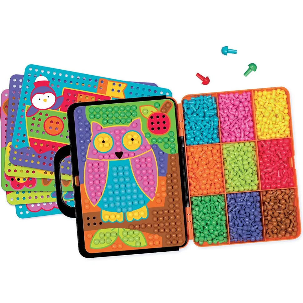 Ce jeu va permettre à votre enfant de développer ses capacités de reconnaissance des couleurs, de manipulation fine, de création et d’imagination autour de l’univers des animaux et des véhicules. Le coffret comprend : – 1 mallette avec deux compartiments de rangement pour les planches et les pions. – 10 planches d’activités colorées. – 675 pions de 9 couleurs différentes. Votre enfant va aimer jouer avec cette mosaïque qui change des traditionnels carrés de couleurs. Il va pouvoir choisir la planche qu’il souhaite réaliser : le hibou, le chat, la tortue mais aussi le bateau, la voiture… les thèmes sont nombreux, il va forcément trouver celui qui lui correspond ! Ensuite, il n’aura plus qu’a clipser sa planche d’activités sur la grille pupitre et à encliqueter les pions ! Un excellent moyen de se familiariser avec les couleurs et d’affiner sa motricité fine.