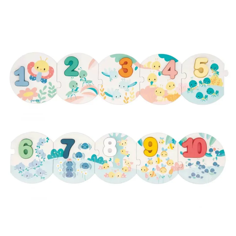 Une fois ce joli puzzle de 10 pièces aux couleurs pastel reconstitué, il faudra replacer le bon chiffre sur son emplacement. Il y a bien sûr l’ordre chronologique mais les enfants pourront également compter sur l’aide des animaux de chaque pièce ! 3 libellules, 8 coccinelles … et le compte est bon !