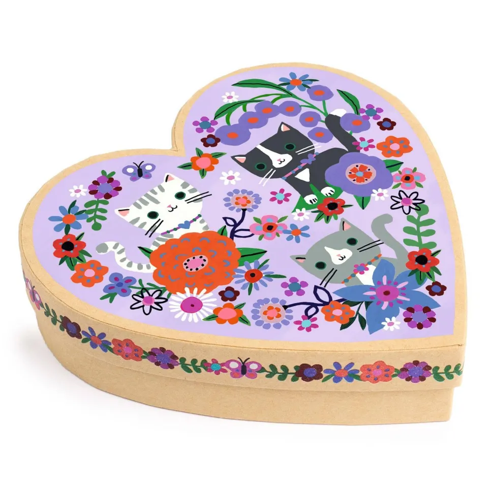 Contenu : 1 boîte cœur imprimée en carton épais, 2 bracelets lien perle plate imprimée, 1 bracelet perles « nouilles » en bois coloré.