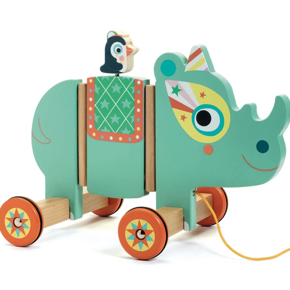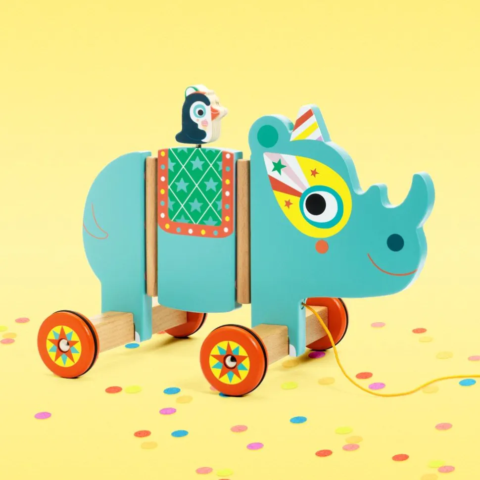 Contenu : 1 jouet à traîner rhinocéros (bois, métal, tissu et silicone).