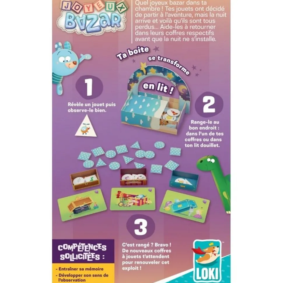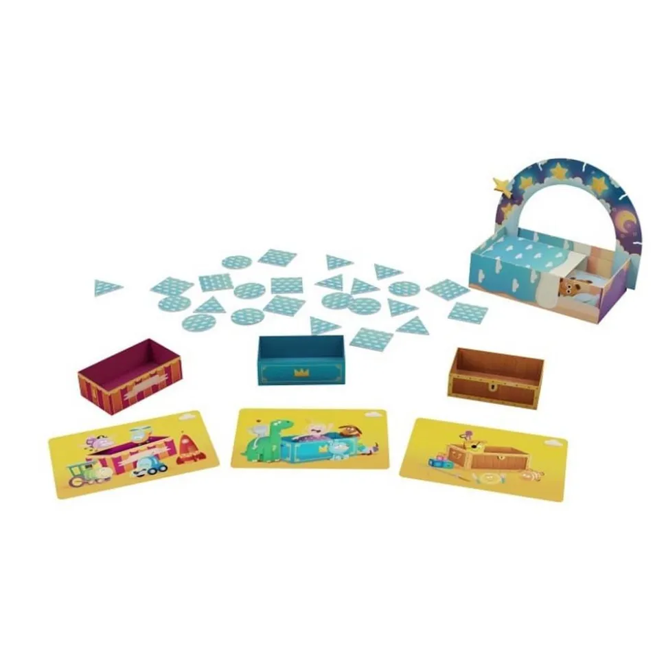 Quel bazar dans ta chambre ! C’est presque l’heure de se coucher, mais tous tes jouets sont partis à l’aventure et se sont perdus ! Ce jeu d’observation et de mémoire invite les enfants à remettre de l’ordre dans leur univers en aidant les jouets égarés à retrouver leurs coffres de rangement avant que la nuit ne tombe. Pour cela, les joueurs retournent un jeton Jouet et doivent observer attentivement son illustration afin de déterminer dans quel coffre il doit être rangé. Si le jouet ne figure sur aucun des coffres visibles, il devra alors être placé dans le lit douillet du joueur. Mais attention, car chaque erreur peut faire apparaître une étoile sur le plateau Nuit, rapprochant ainsi tous les joueurs de la fin de la partie. Le défi est donc de bien observer, de mémoriser les emplacements et de faire preuve de logique pour progresser ensemble. Ce jeu coopératif propose plusieurs niveaux de difficulté grâce aux cartes Coffres modulables, pour s’adapter à l’évolution des compétences de l’enfant. Une fois les jouets bien rangés, on peut vérifier les coffres et recommencer une partie encore plus palpitante avec de nouveaux défis visuels.