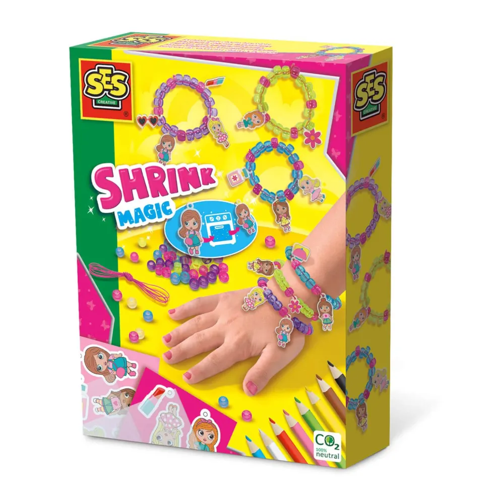 Avec le film rétractable magique de SES Creative, les enfants peuvent créer de magnifiques breloques ! Il est possible d’utiliser les fashionistas fournies ou d’en créer d’autres, sans aucune limite. Les enfants peuvent dessiner sur le film avec les crayons de couleur. Ensuite, ils peuvent colorier leurs dessins et créer des tenues uniques pour leurs personnages. Découpe les figurines et fais un trou avec le perforateur. Et maintenant, au four ! Avec la chaleur, les breloques rétrécissent et deviennent plus épaisses et solides. Une fois qu’elles ont rétréci, elles peuvent être enfilées sur des bracelets. Le cordon élastique et les perles permettent aux enfants de fabriquer facilement leurs propres bijoux.
