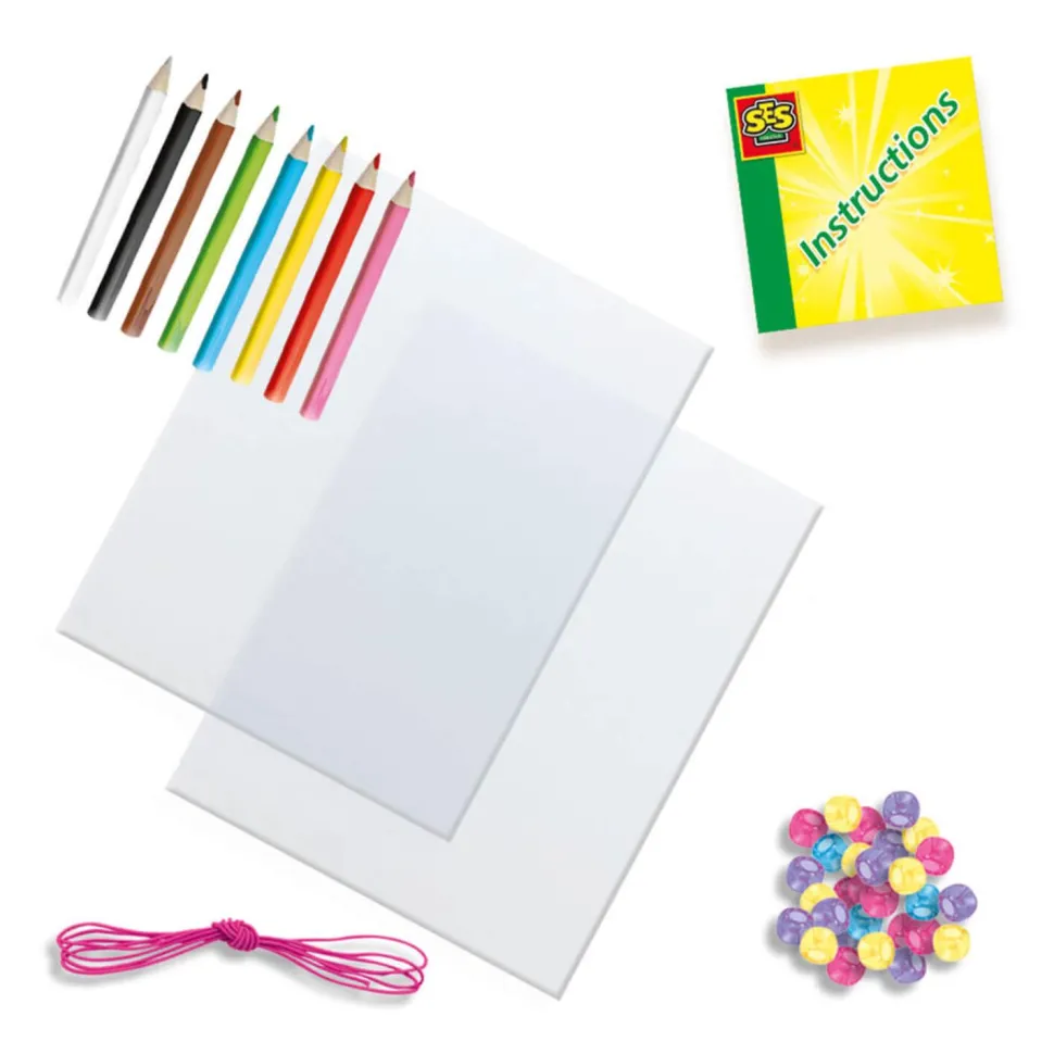 Contenu : 2 feuilles de film rétractable magique, 8 crayons de couleur, cordon élastique rose, mélange de perles de 4 couleurs, instructions avec exemples de tracés.