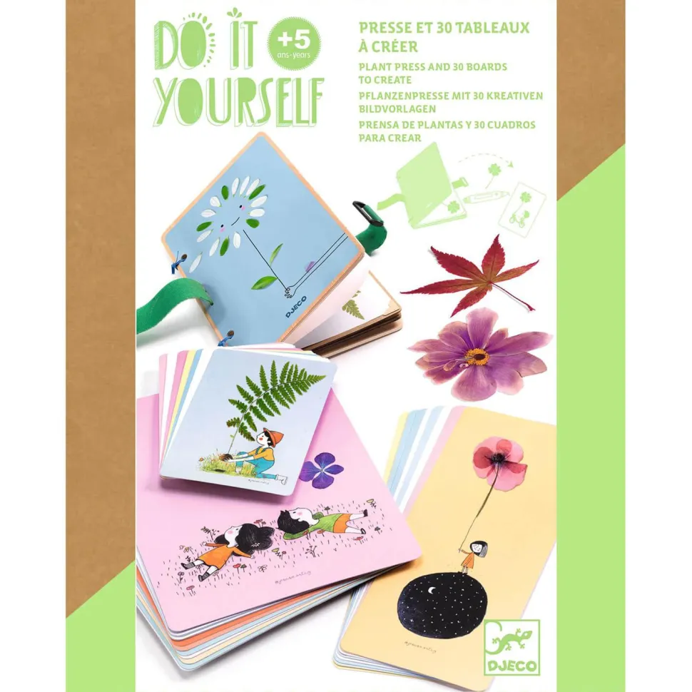 Un kit créatif pour faire découvrir la beauté de la nature aux enfants. Il contient une presse à assembler et à emmener en balade pour y récolter plantes et fleurs, et 30 tableaux et cartes à décorer.