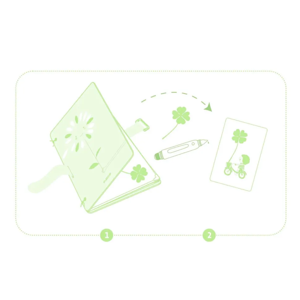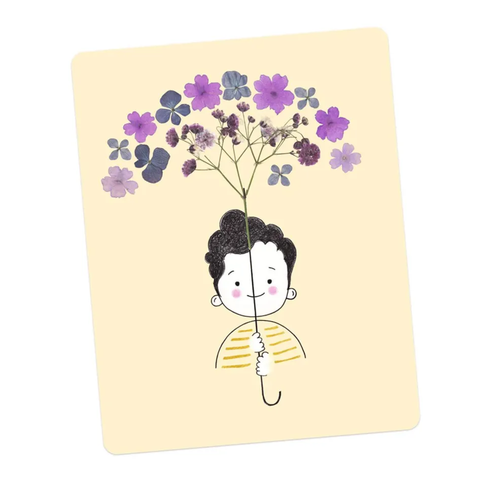 Une fois pressées et séchées, l’enfant colle les plantes récoltées sur les tableaux et cartes poétiquement illustrés. Une jolie pochette à élastique permet de conserver les plantes séchées non utilisées et de ranger tous les tableaux et cartes.