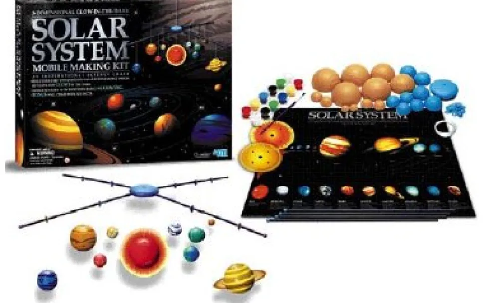 Ce kit a été approuvé par le Musée des Sciences de Londres qui le recommande dans le cadre d’une initiation scientifique des enfants à partir de 7 ans. Objectif : recréer le système solaire sous la forme d’un mobile géant (75 x 75 cm d’envergure une fois assemblé) qui tourne et scintille dans l’obscurité.Contenu du kit : – Les planètes du système solaire encastrables en plastique- Ensemble complet de structures et tiges de suspension faciles à assembler- Peinture qui scintille dans l’obscurité- 1 pinceau- Des instructions de montage.