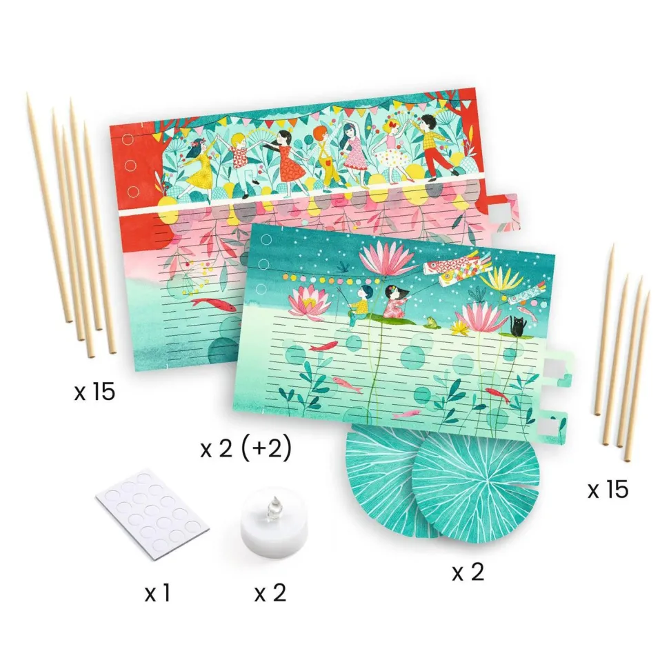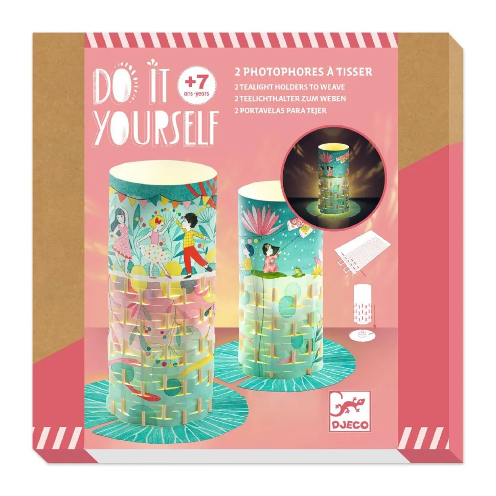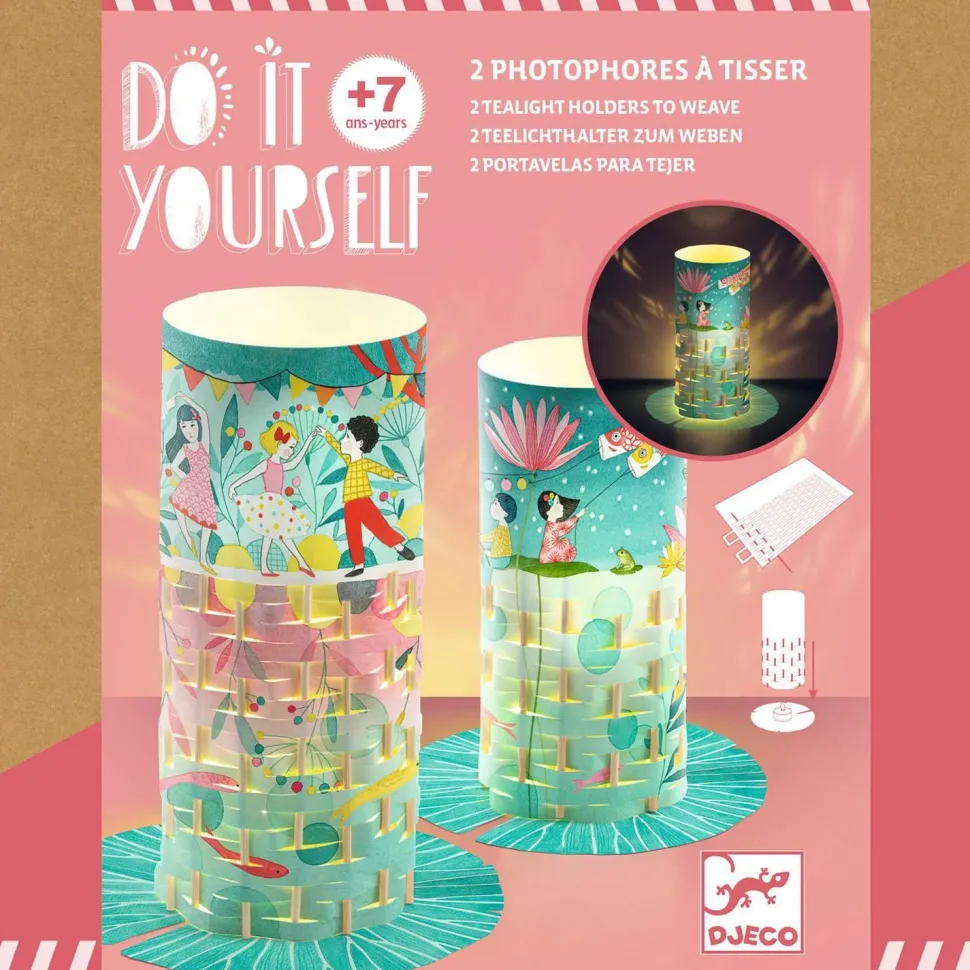 La marque Djeco présente Kit phosphores à créer, Danse des lucioles ! Un kit créatif avec 2 photophores en papier à tisser à l’aide de tiges en bambou naturel. Il suffit de se laisser guider par les instructions imprimées au dos des lanternes pour apprendre à tisser le papier. Une fois le tissage effectué, l’enfant dépose les délicates lanternes sur les plateaux nénuphars fournis pour créer une ambiance chaleureuse de jour comme de nuit. 2 bougies LED fournies avec timer de 30 minutes pour économiser les piles. Un produit en papier et carton certifié FSC®. Contenu : 2 photophores papier à tisser x 2 dimensions (+ 2 exemplaires additionnels d?entrainement), 2 sets de 15 tiges en bambou (2 longueurs), 1 planche de stickers double-face, 2 bougies LED (piles incluses), 2 plateaux décoratifs pour les lanternes, 1 feuillet de pas-à-pas détaillé. A partir de 7 ans.