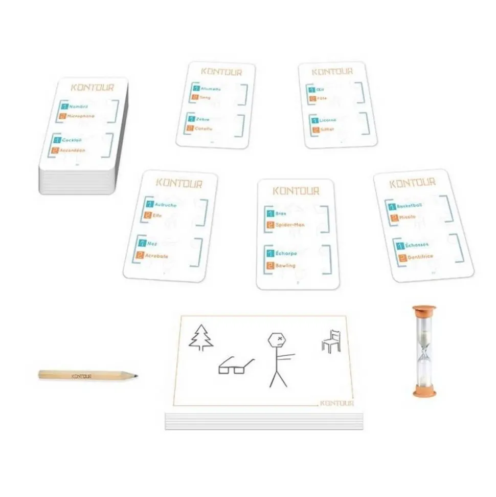 Découvrez le jeu d’ambiance Kontour, un jeu de dessin original qui tient dans la poche et ne demande aucun talent de dessinateur !Le principe : 1 Concept, 15 traits, 30 SecondesBut du jeu : faire deviner aux autres un mot, mais attention : ils ne disposent que de 30 secondes et 15 traits pour y parvenir ! Il faut faire preuve d’imagination et d’un esprit de simplification pour remporter la victoire. Contenu de la boîte :- 72 cartes- 1 bloc de dessin,- 1 crayon- 1 sablier,- 1 règle du jeu,- 1 boîte métal.Durée de la partie : 20 min environ.Nombre de joueurs : 3-7.A partir de 10 ans.