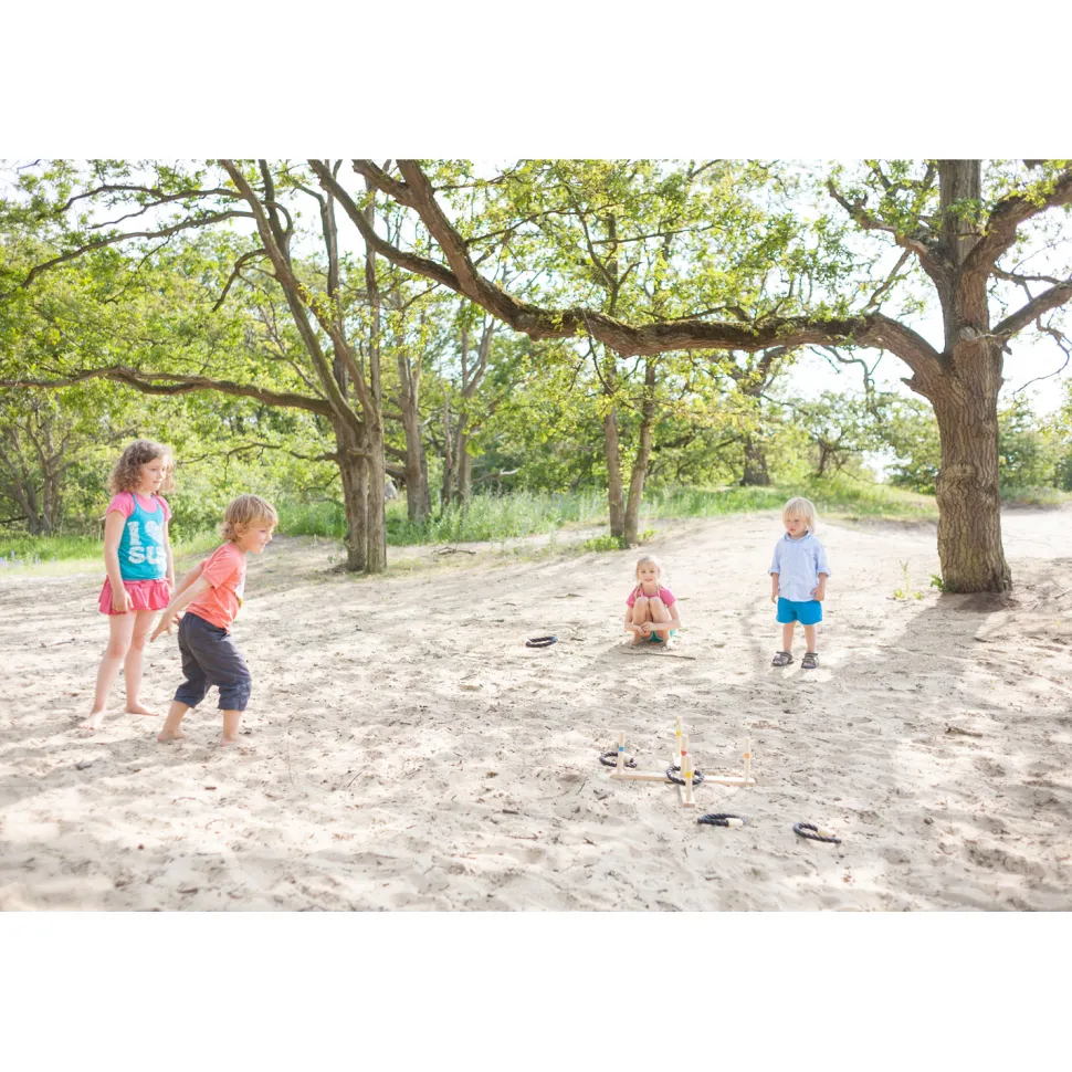 Un jeu d’adresse traditionnel en bois qui plongera les enfants et toute la famille dans une ambiance de kermesse.Très simple, ce jeu se compose d’une structure en bois en forme de croix sur laquelle sont fixés 5 bâtons et 5 anneaux en corde tressée de coloris noir. Le jeu consiste à lancer vos anneaux de sorte qu’ils tombent autour des poteaux en bois. Si vous visez juste vous obtiendrez des points. Chaque bâton étant associé à un nombre de points, le nombre de points remporté varie donc en fonction de la zone du lancer.Faites donc preuve de beaucoup d’adresse pour viser juste et soyez stratégique pour remporter le plus de points.Ce jeu se pratique en extérieur.Dimensions du jeu : 50 cm de largeur x 10 cm de hauteur.Dimensions du coffret de jeu : 51 x 16 x 5 cm.