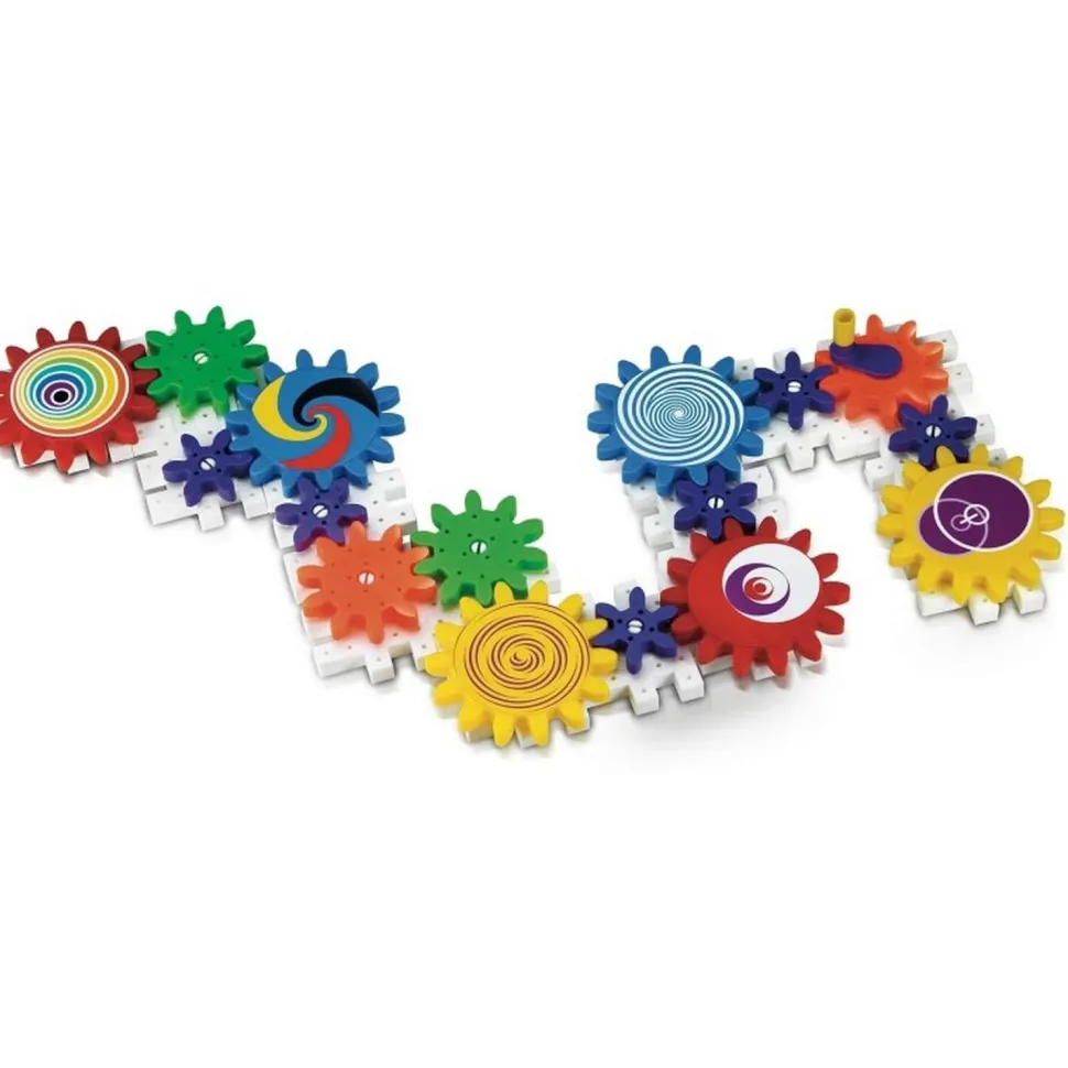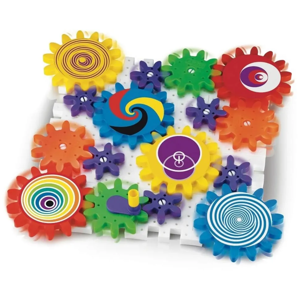En combinant les 55 pièces fournies, dont des plaques carrées dentelées et des engrenages colorés, les enfants pourront expérimenter des montages variés et découvrir des effets visuels captivants en actionnant leurs créations.